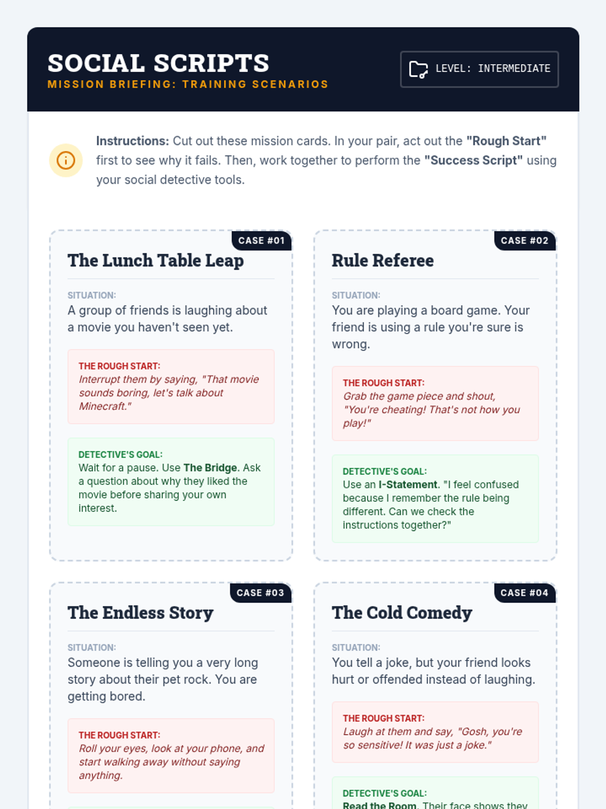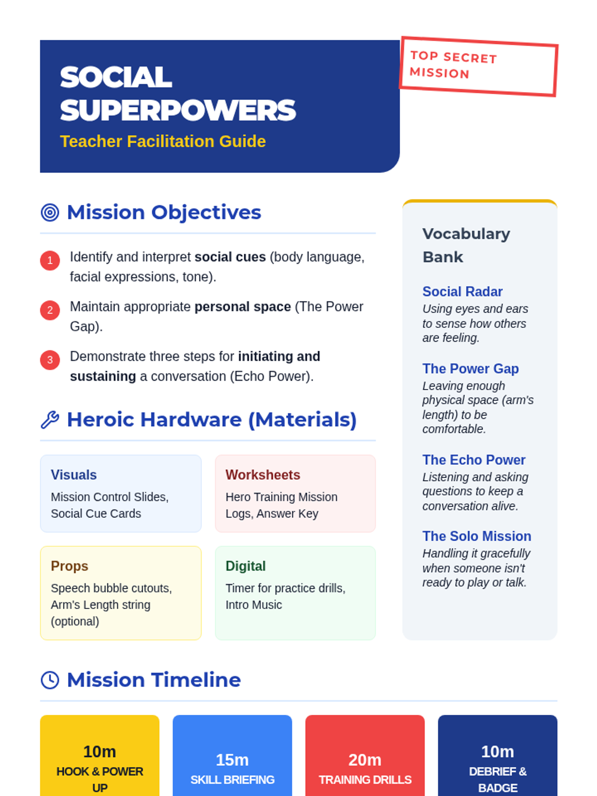 A comprehensive social skills curriculum designed to help students navigate school and community interactions with confidence. Students learn to read social cues, join groups, and communicate effectively through a superhero-themed framework.