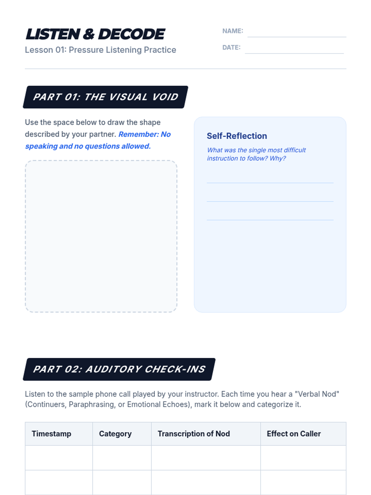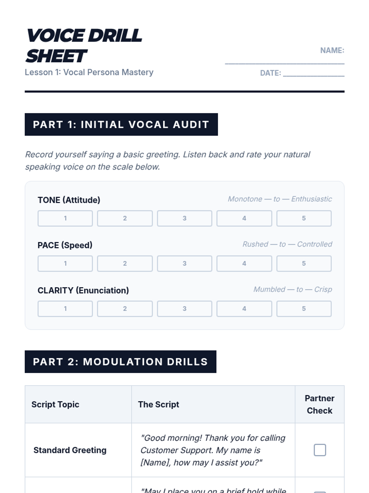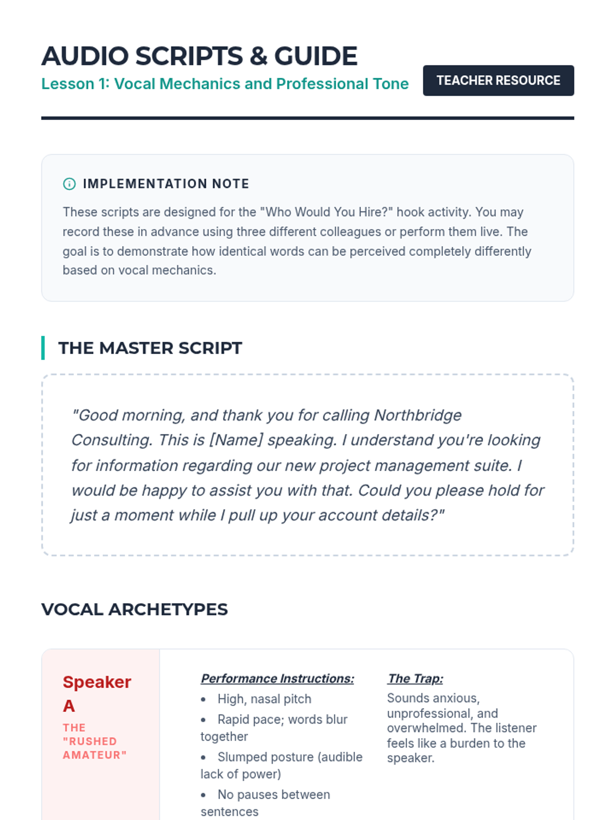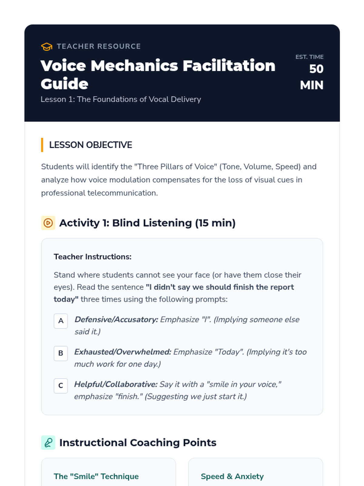 A game-based sequence focusing on the vocal mechanics of phone communication, including enunciation, pacing, volume, and emotional tone. Students build professional audio communication skills through interactive drills and simulations.