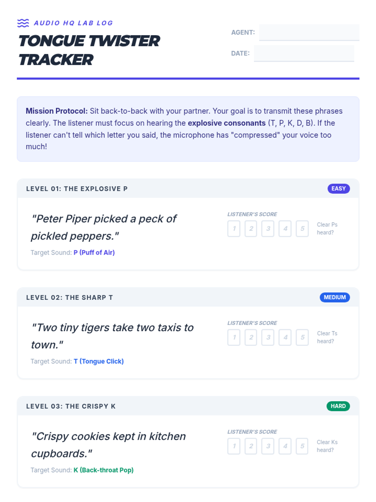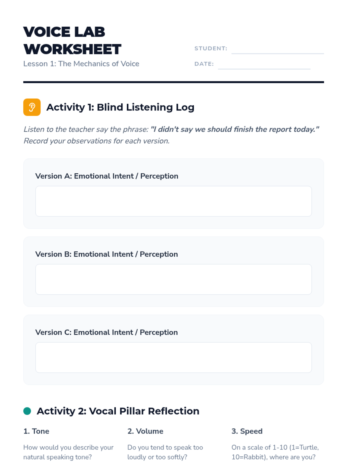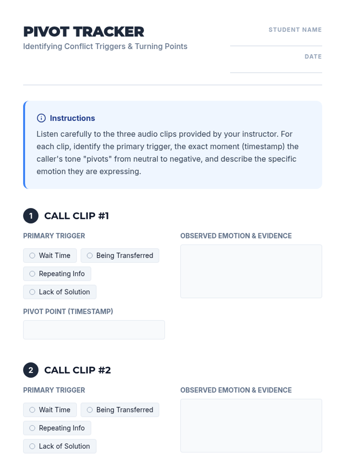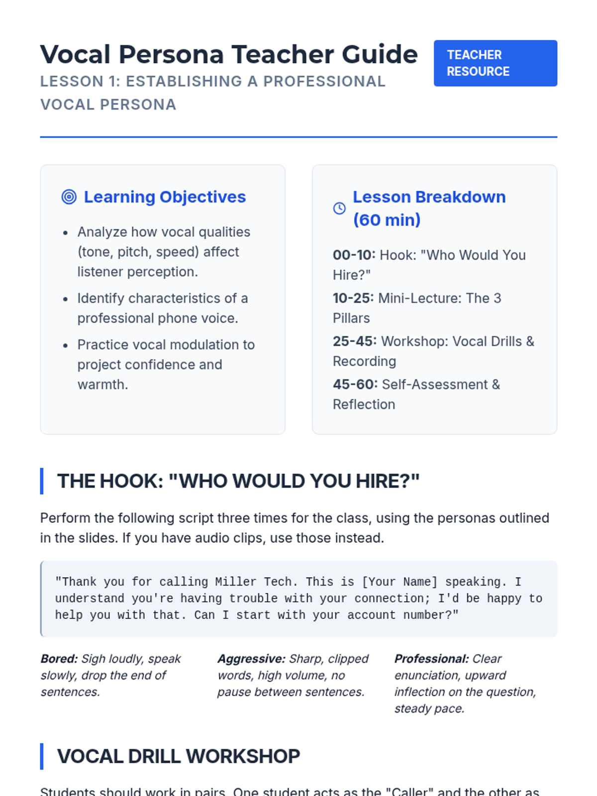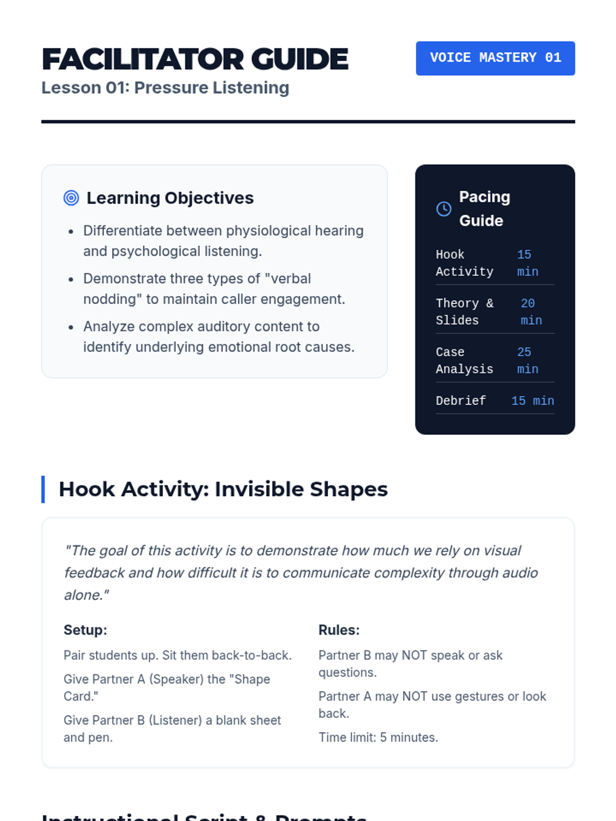 A game-based sequence focusing on the vocal mechanics of phone communication, including enunciation, pacing, volume, and emotional tone. Students build professional audio communication skills through interactive drills and simulations.