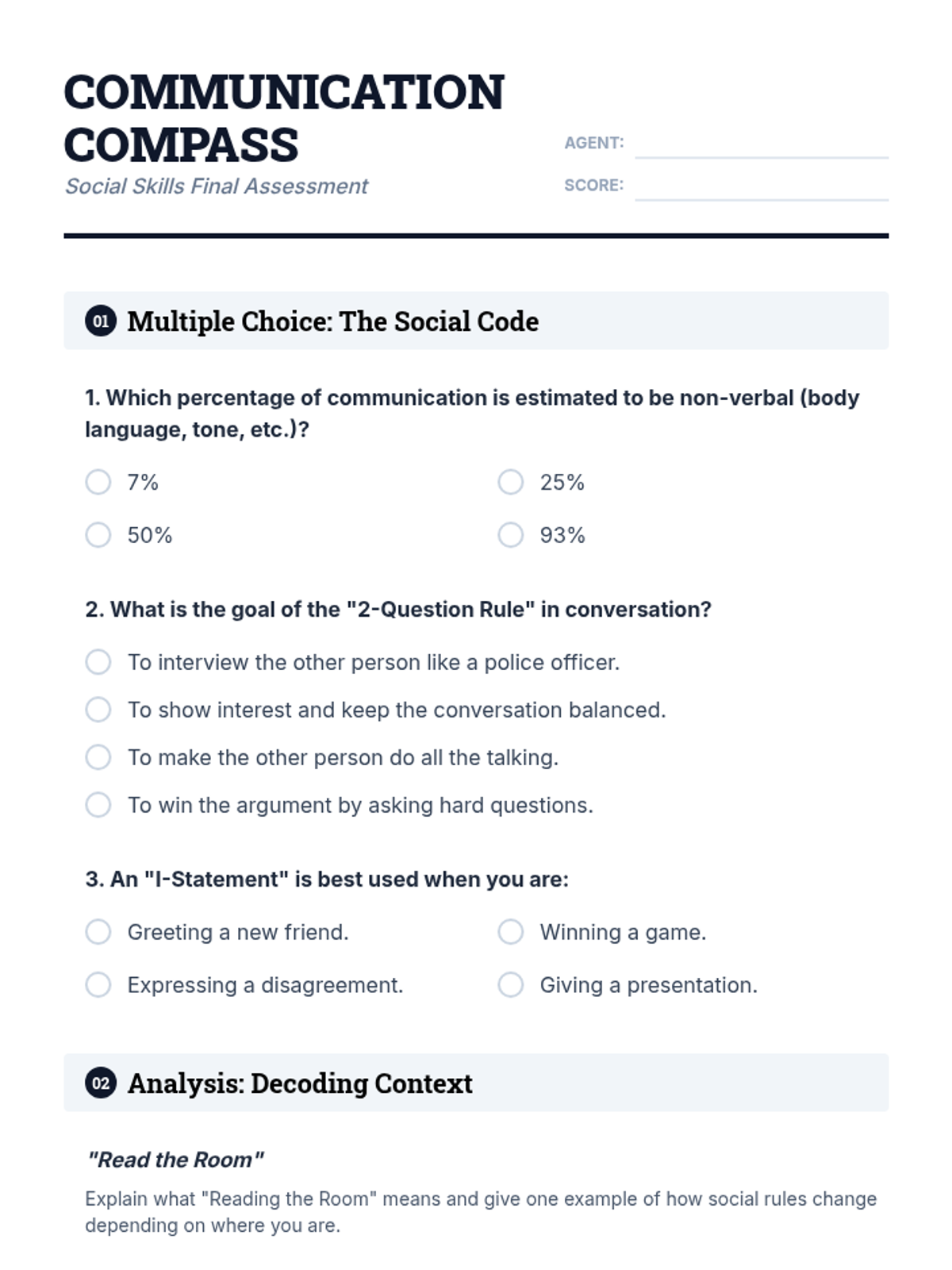 An advanced five-part professional development series for 11th graders focusing on the psychology of conflict, high-stakes communication, and strategic diplomacy. Students prepare for adult environments by mastering emotional intelligence, interest-based negotiation, and professional digital protocols.
