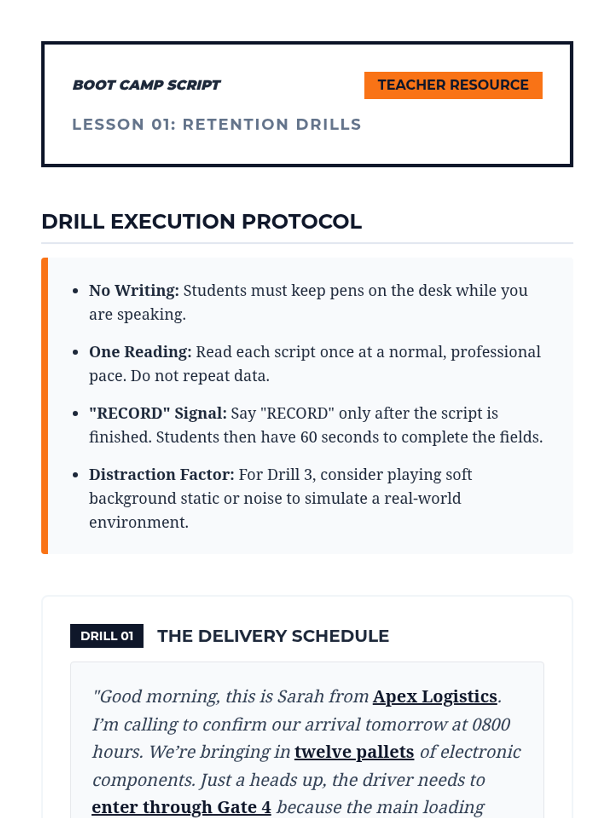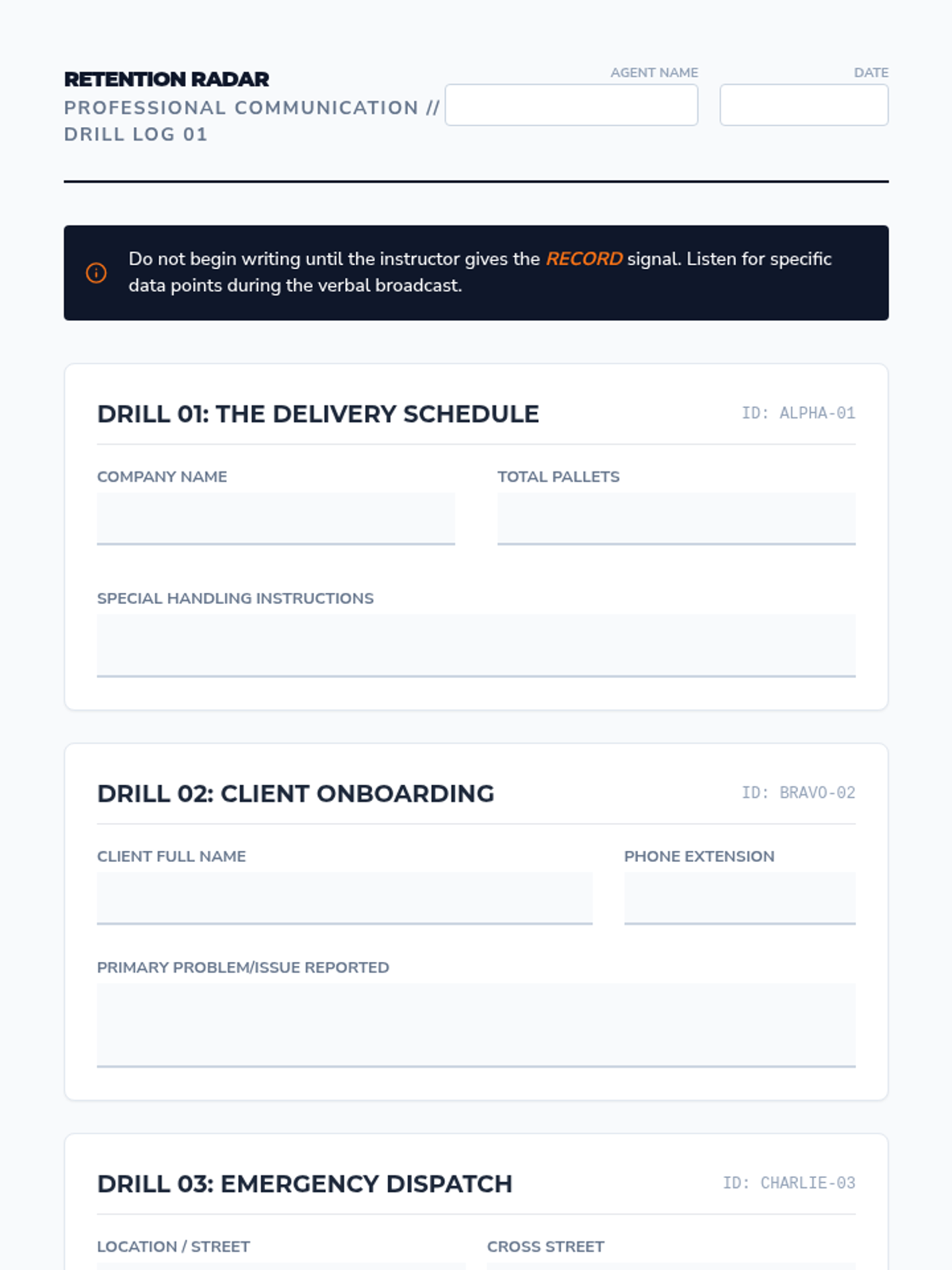 This sequence treats phone communication as a high-precision discipline. Students master active listening, the NATO phonetic alphabet, information filtering, and verification techniques to ensure the integrity of data moving from verbal to written formats.