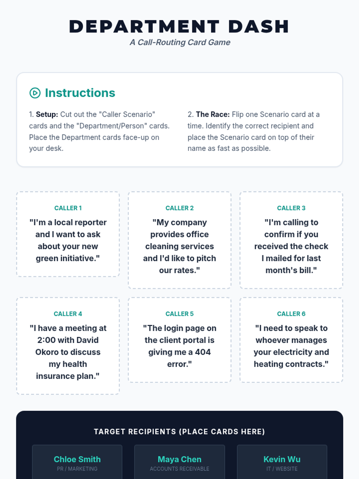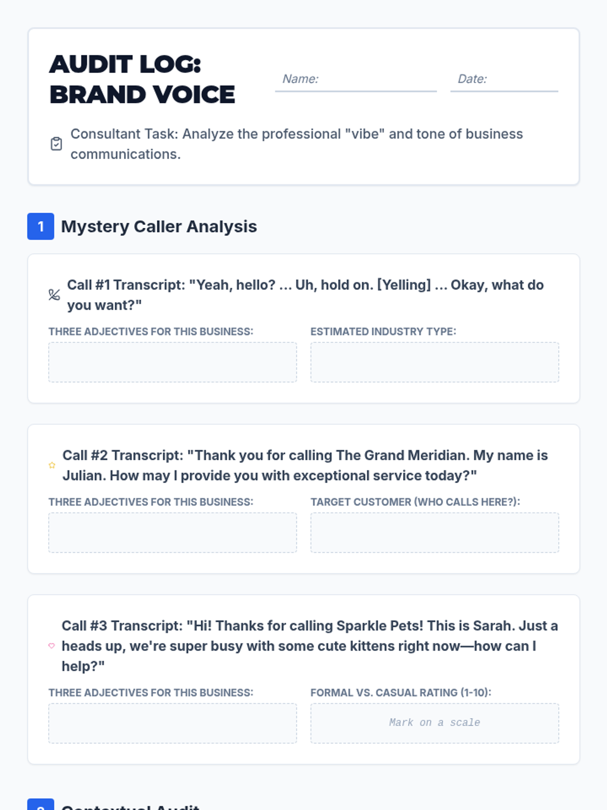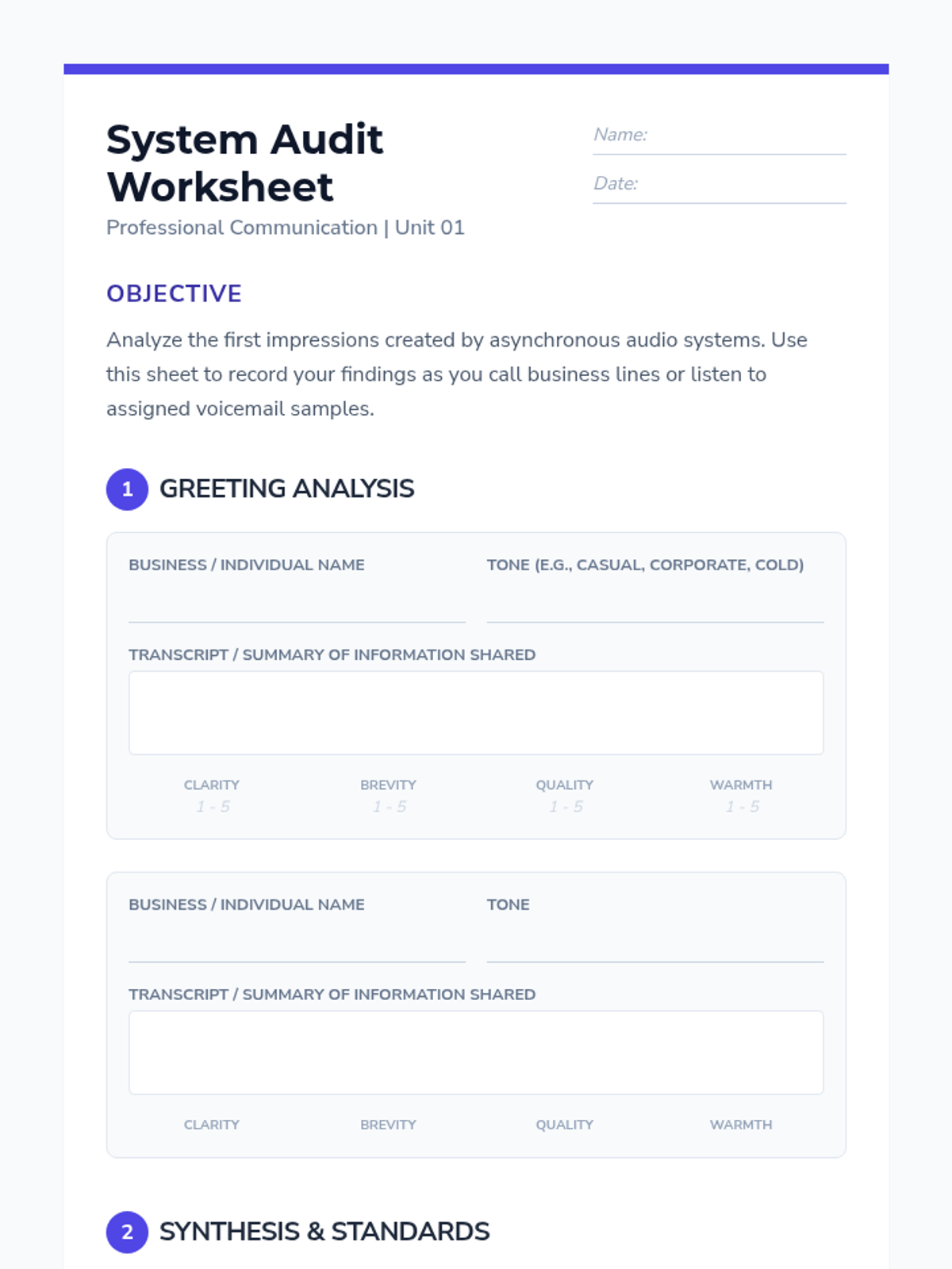 A case-study driven sequence where students act as communication consultants to evaluate and improve business phone protocols, focusing on brand identity, privacy, and etiquette.