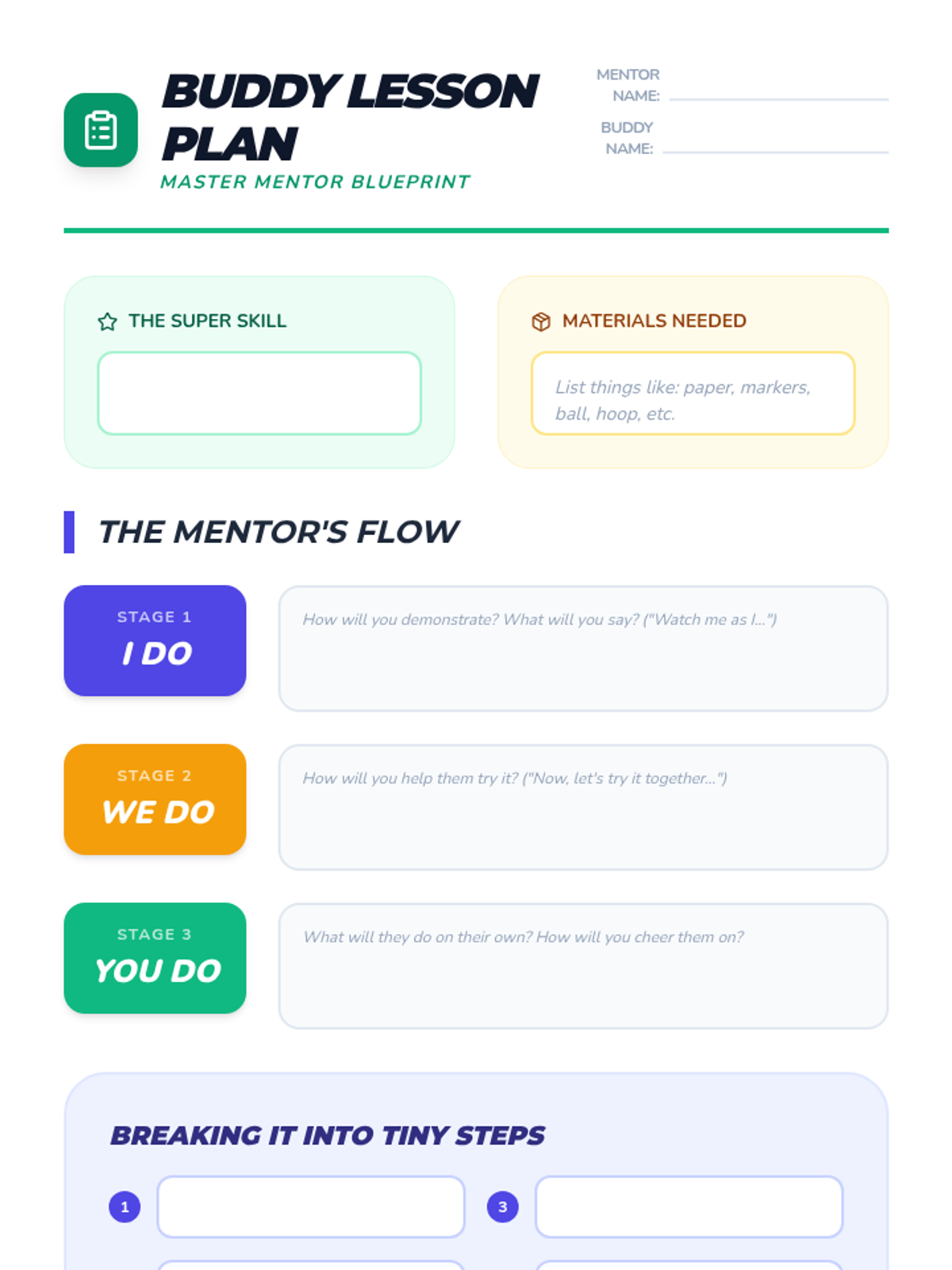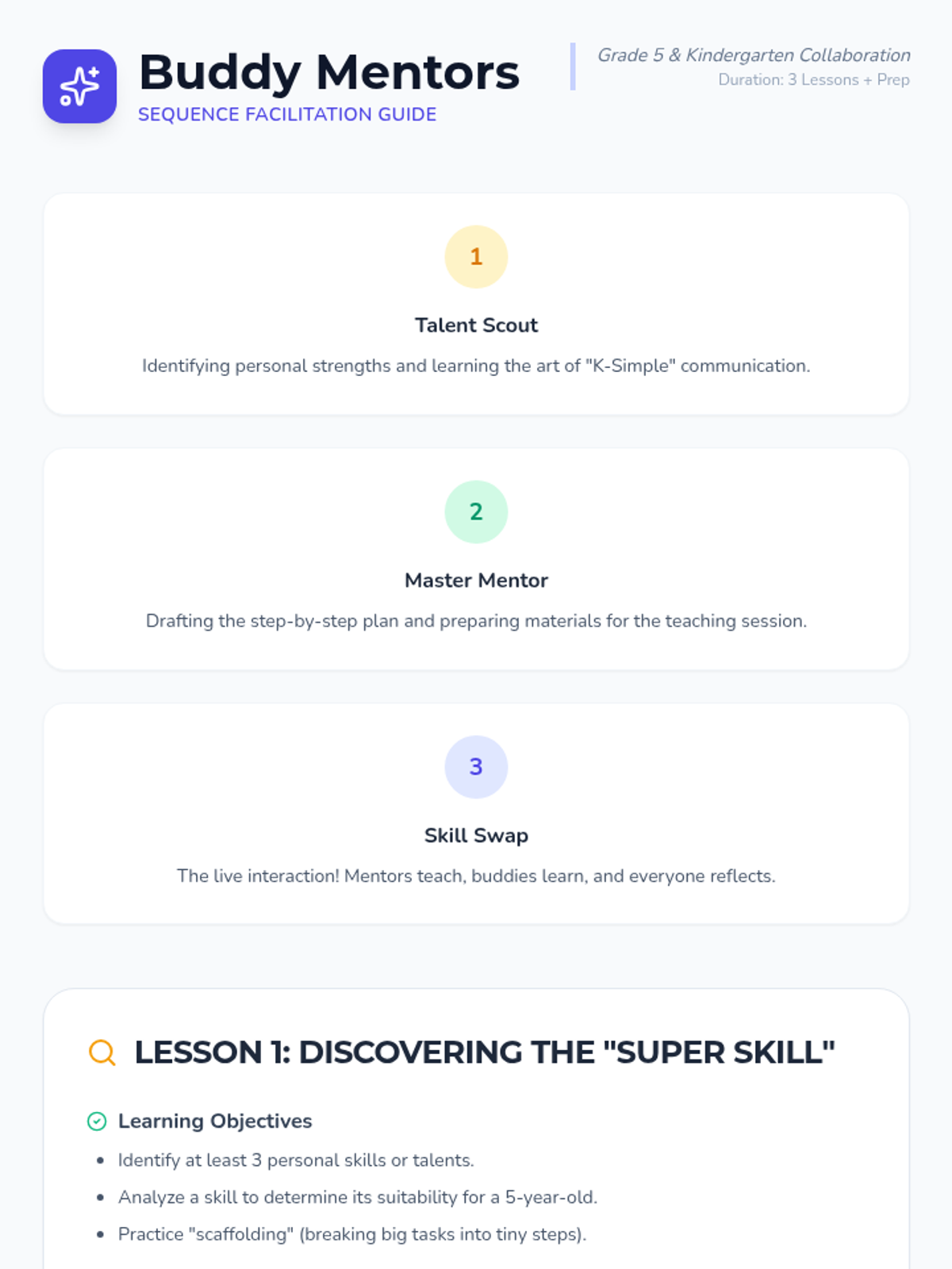 A three-part sequence where Grade 5 students prepare for and then execute a peer-mentoring session with their Kindergarten buddies, focusing on teaching a personal skill or talent.