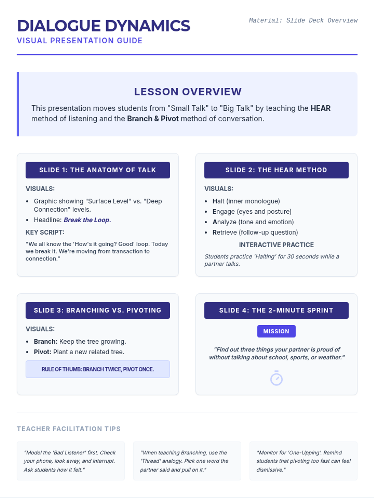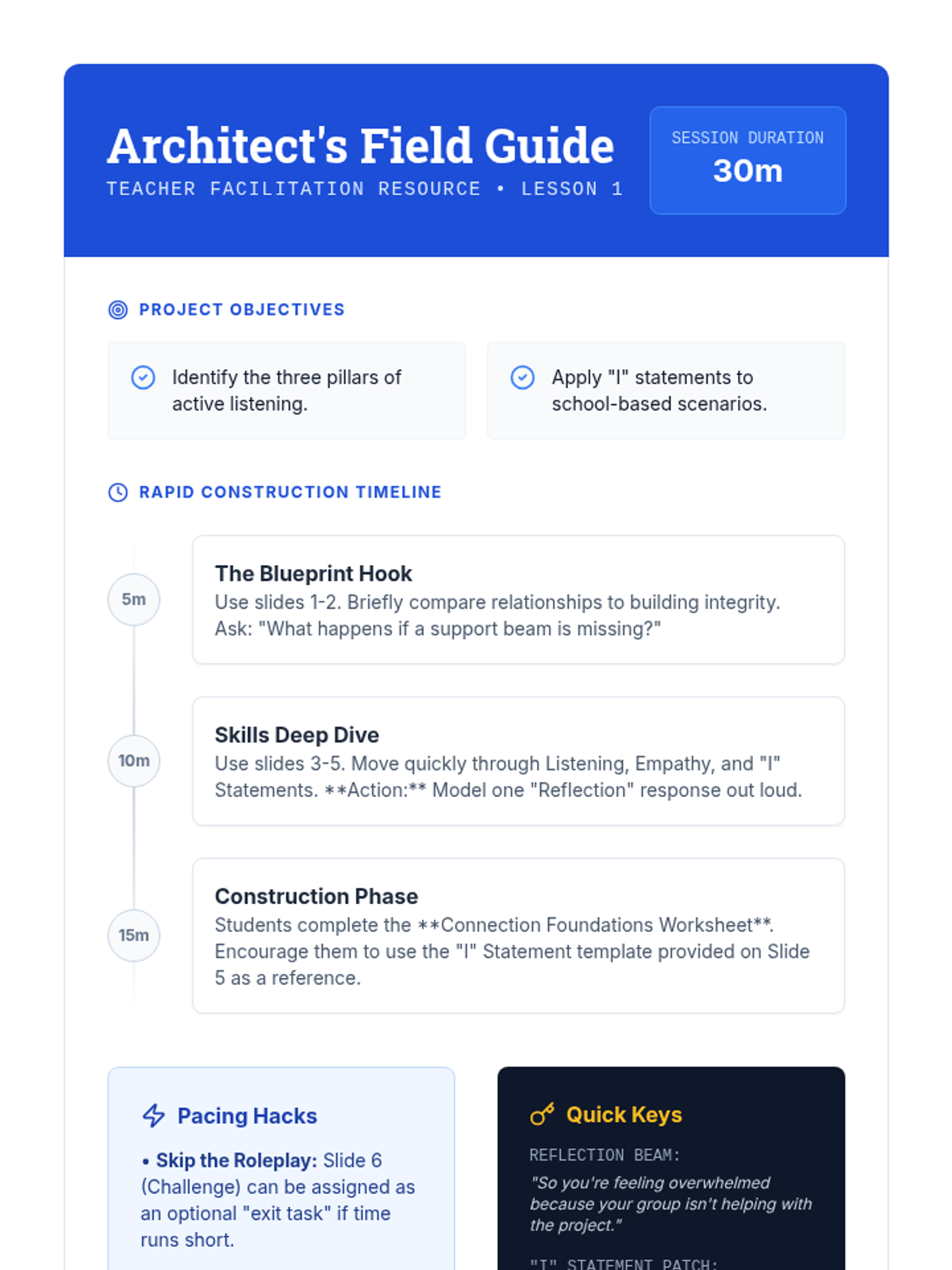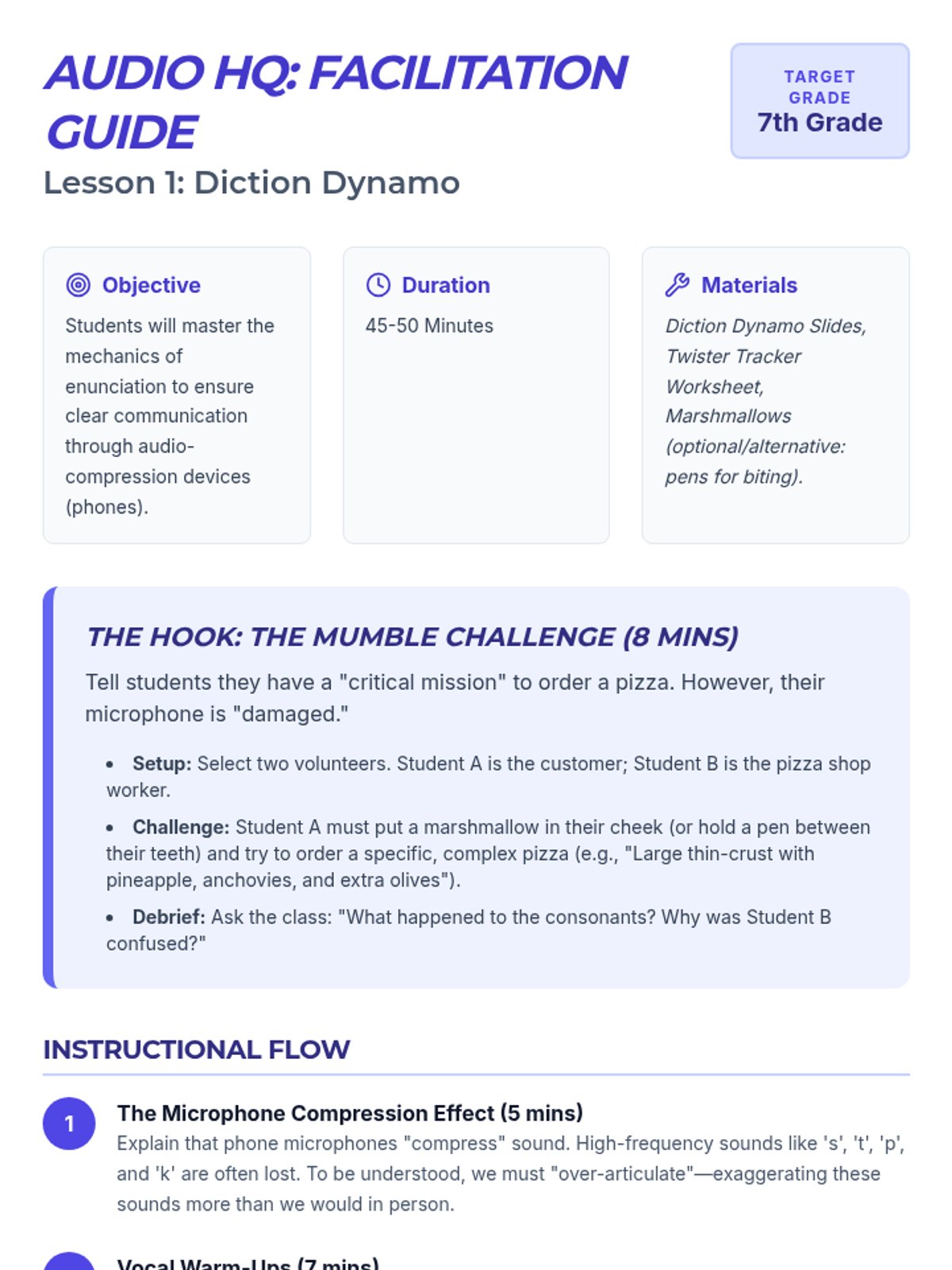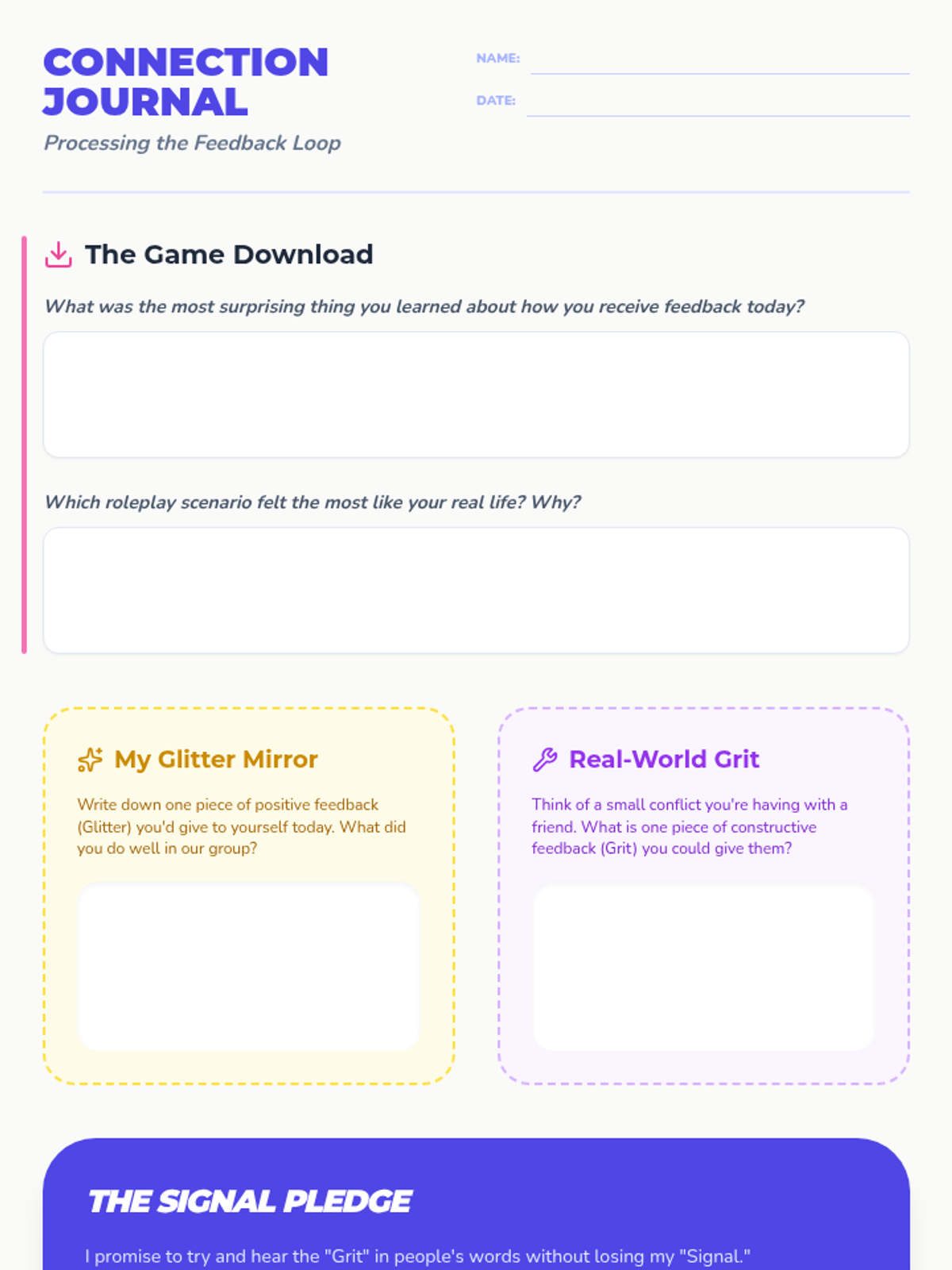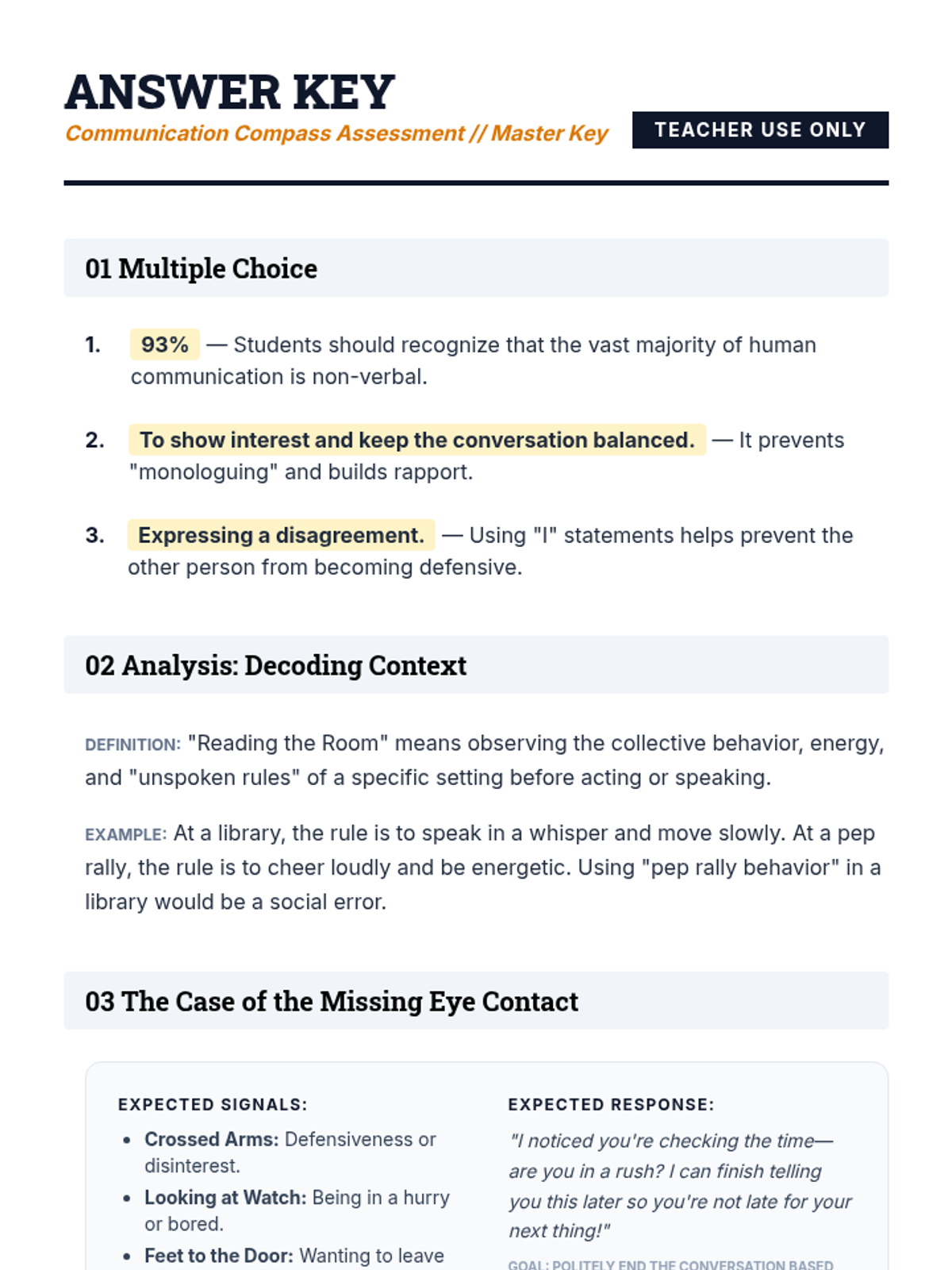 A 5-day communication and emotional intelligence unit for 8th graders. Using the metaphor of radio signals, students learn to identify emotional "static," regulate their "frequency," and broadcast "clear signals" in collaborative environments.