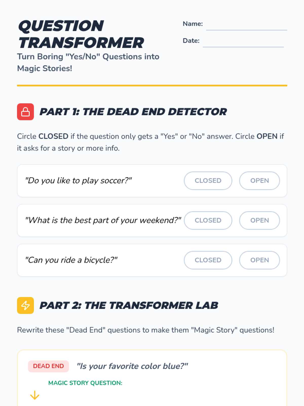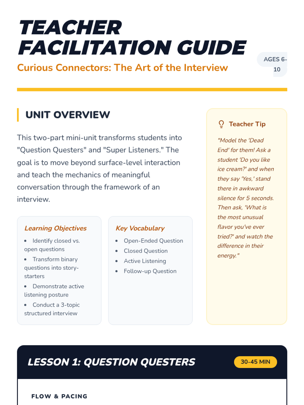 A two-part series designed for students aged 6-10 to master the art of the interview, focusing on crafting open-ended questions and practicing active listening to build connections.