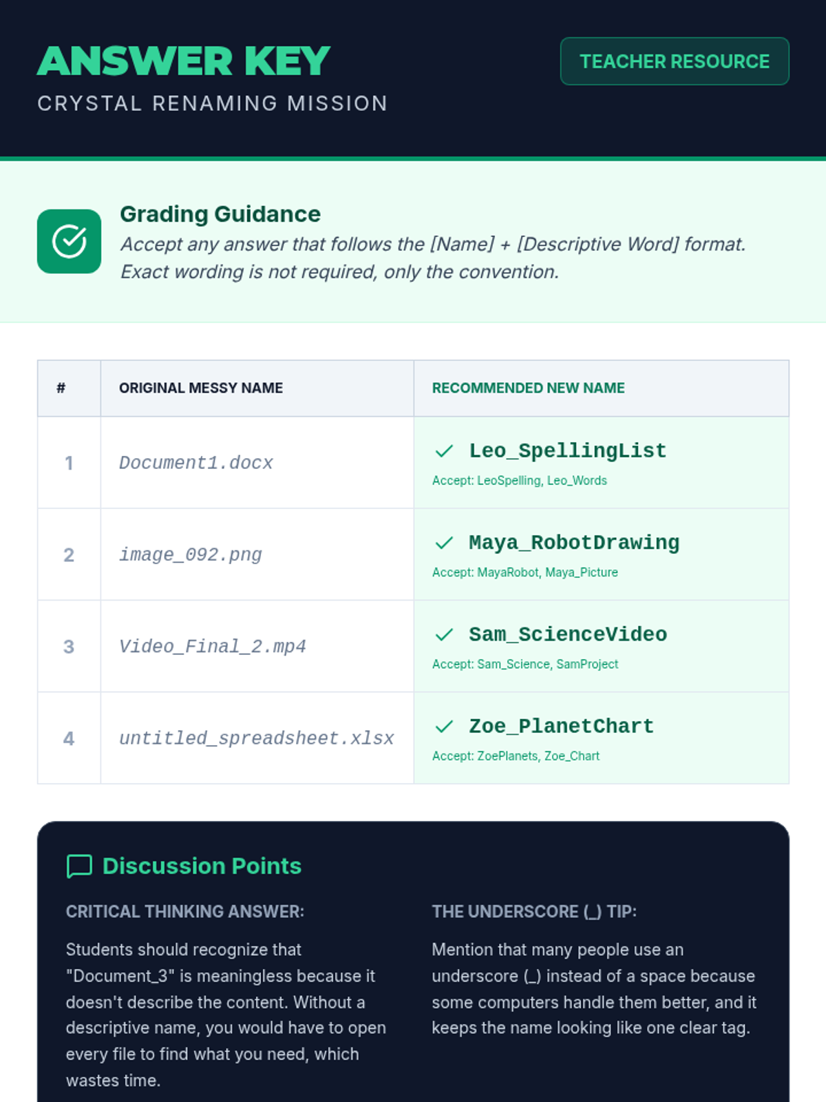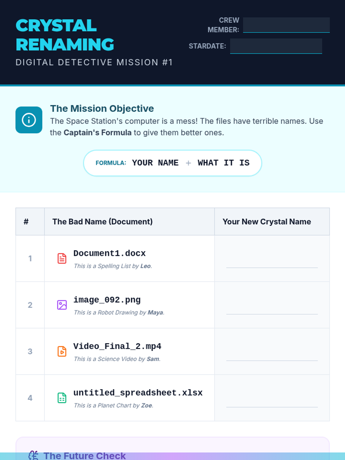 A 2nd-grade sequence on digital literacy focusing on file naming, folder organization, search retrieval, cloud storage, and digital collaboration. Students learn to maintain a clean digital workspace through a 'Cyber Space Station' theme.