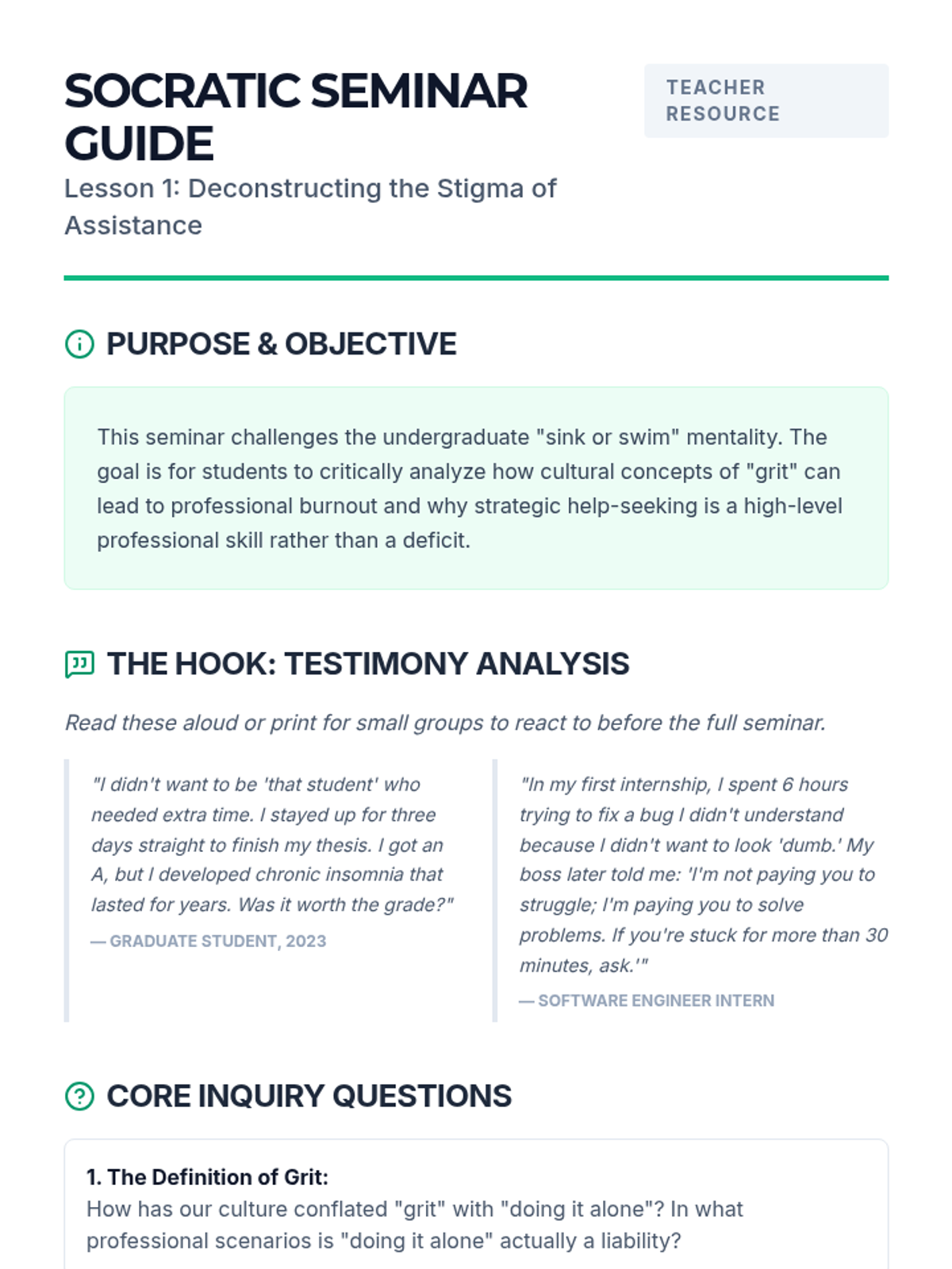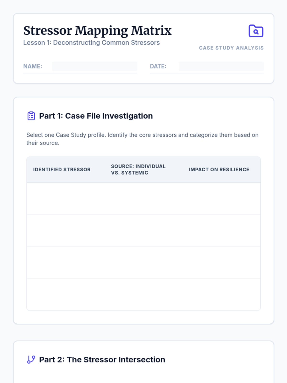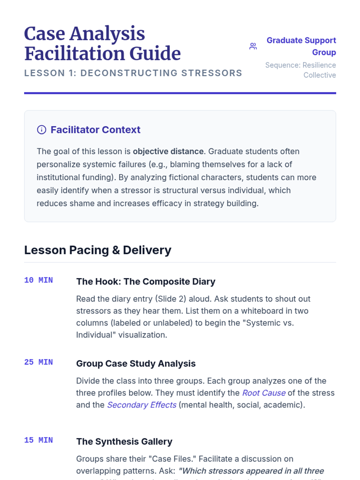 A case-study-driven sequence for graduate students to analyze professional stressors and develop evidence-based resilience strategies through collective insight.