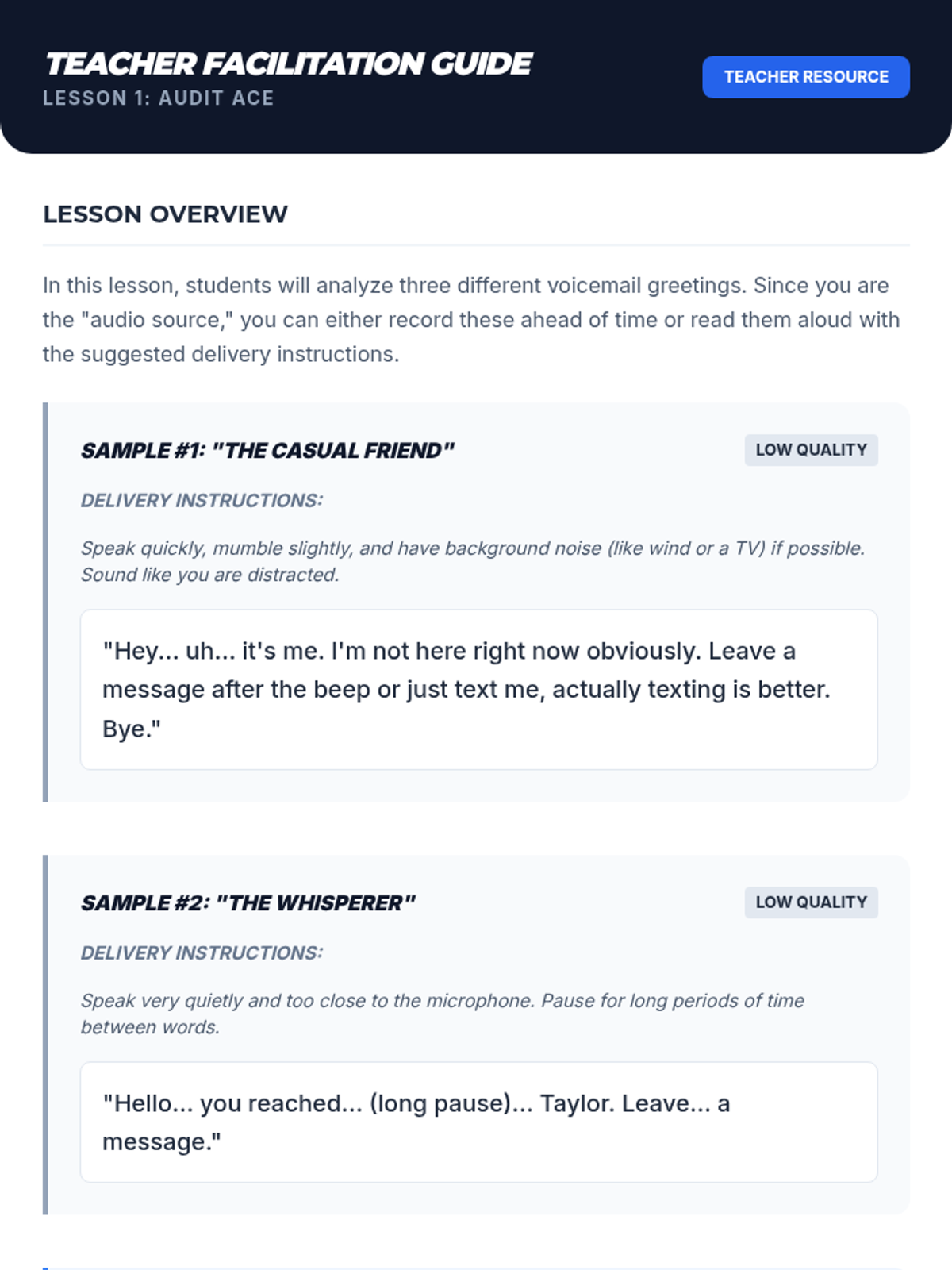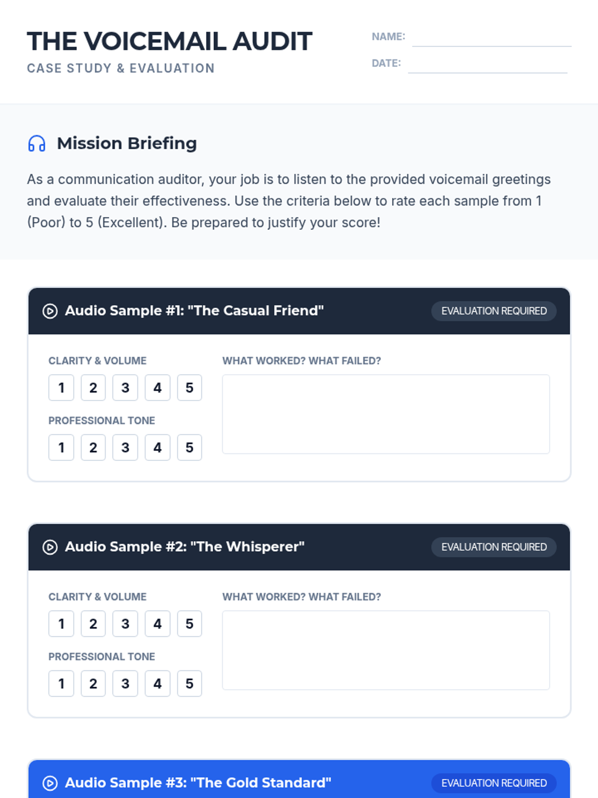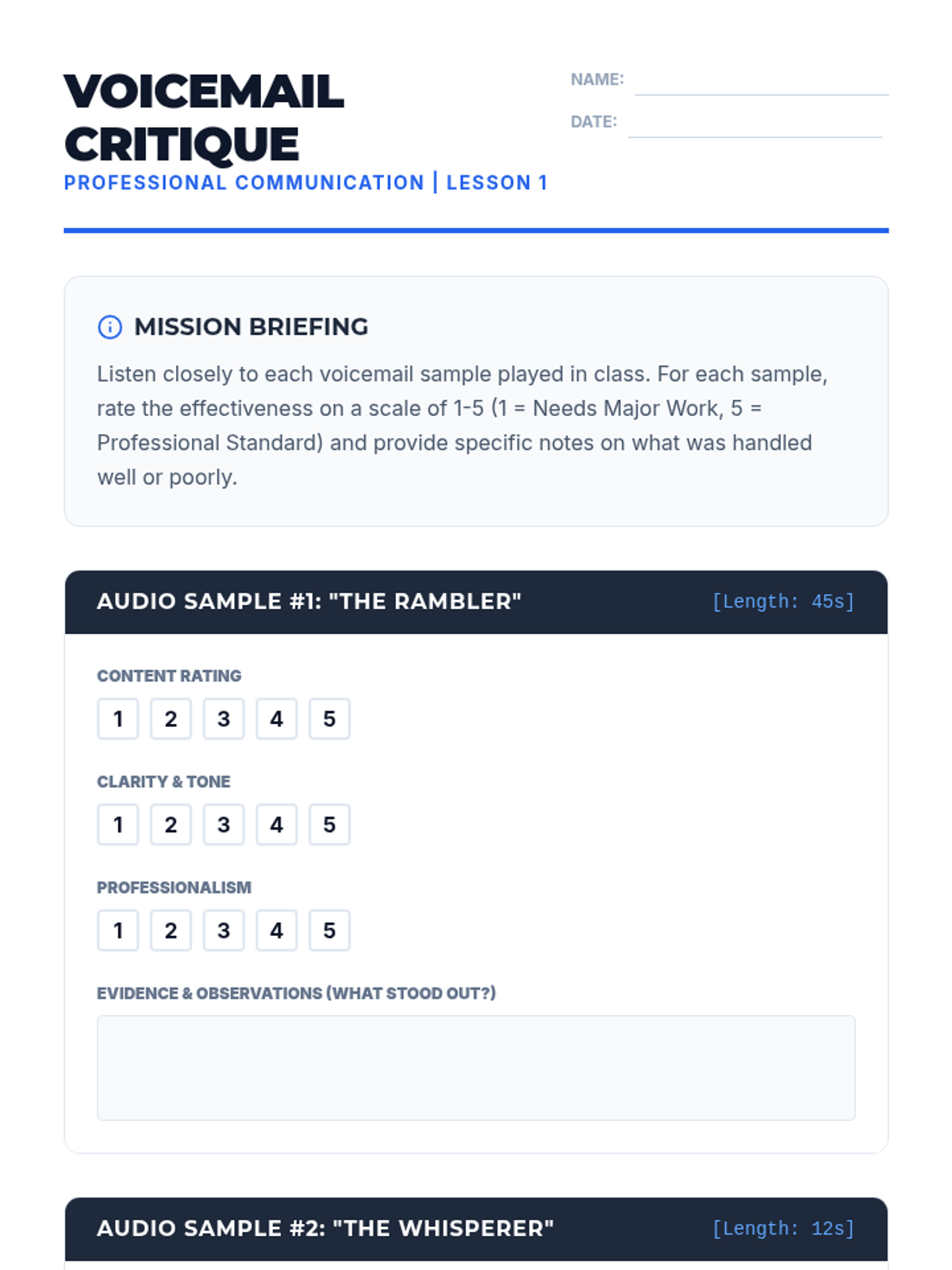 This project-based sequence explores the world of asynchronous audio communication, specifically voicemail systems. Students investigate professional standards, script their own greetings, and practice leaving clear, actionable messages, culminating in a digital audio portfolio.