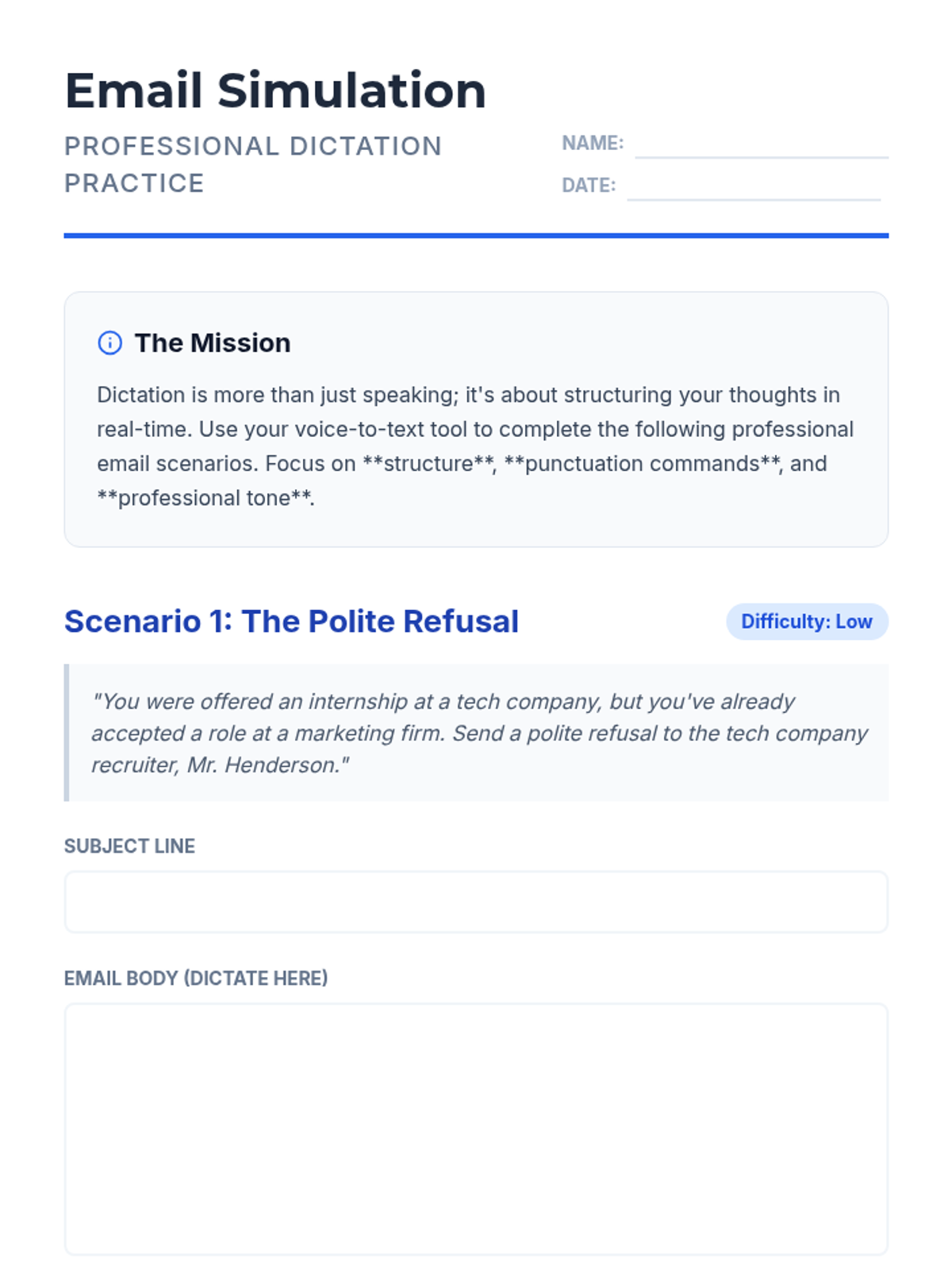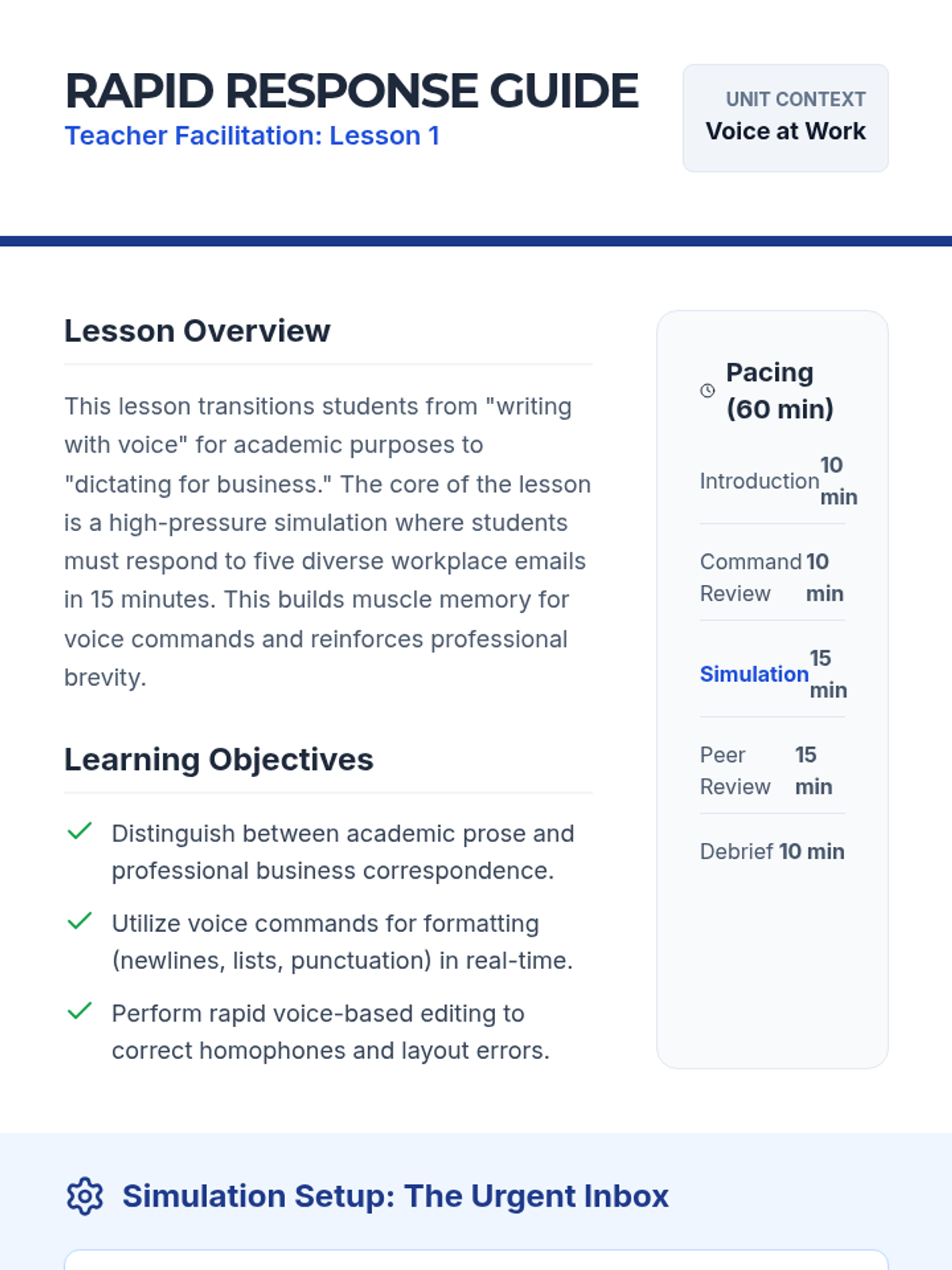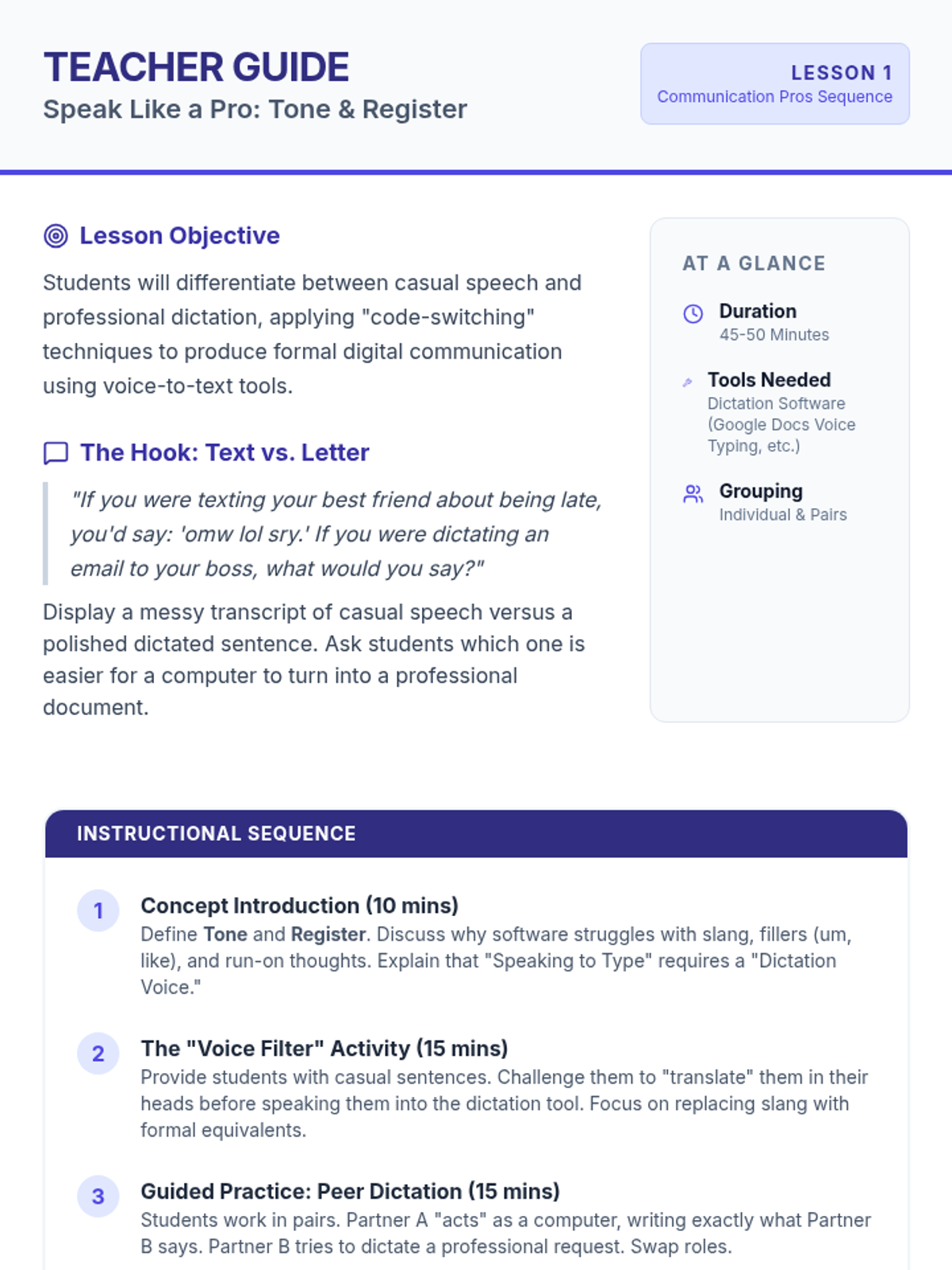 A 5-lesson unit for 7th-grade students focusing on the professional application of dictation technology. Students transition from casual speech to formal digital communication, mastering email efficiency, technical troubleshooting, and self-advocacy skills through workplace simulations.