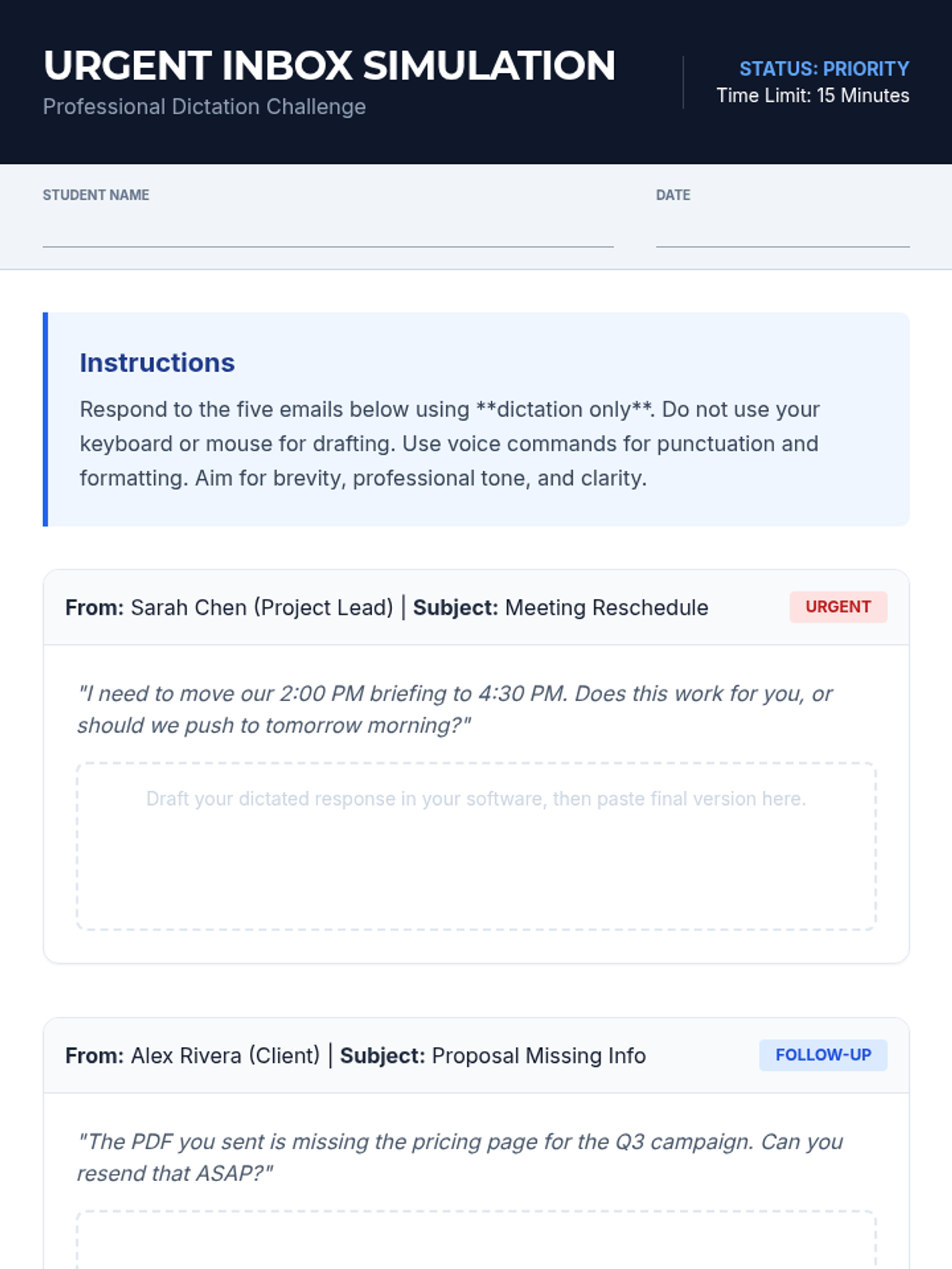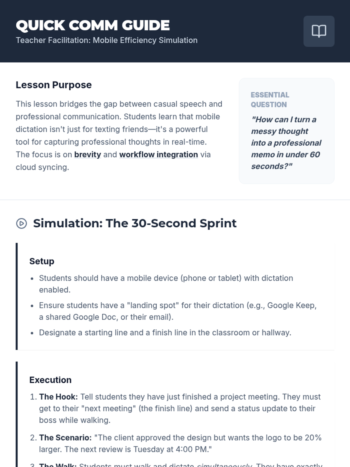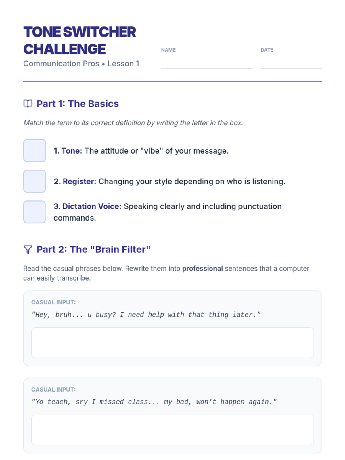 A 5-lesson unit for 7th-grade students focusing on the professional application of dictation technology. Students transition from casual speech to formal digital communication, mastering email efficiency, technical troubleshooting, and self-advocacy skills through workplace simulations.