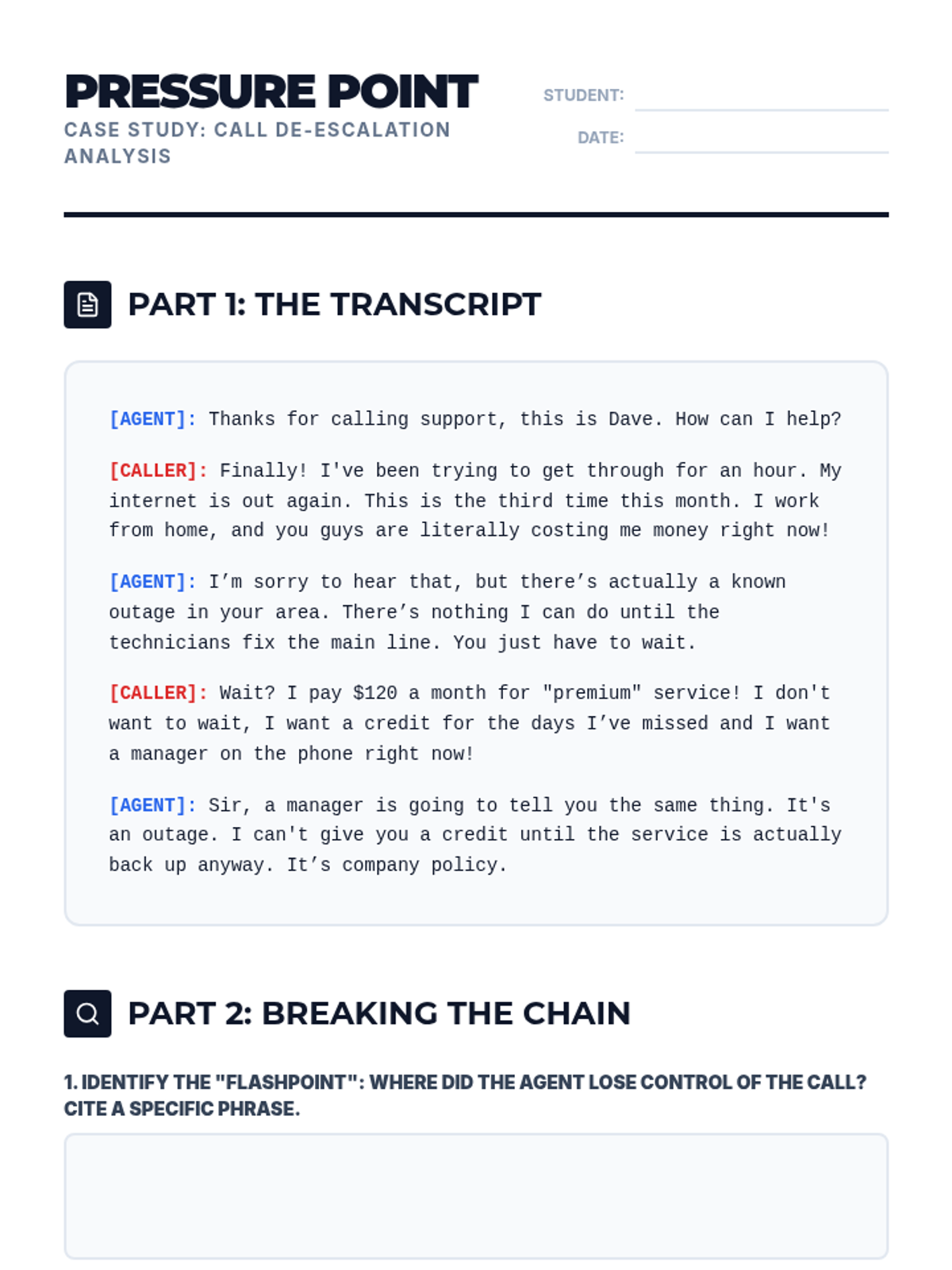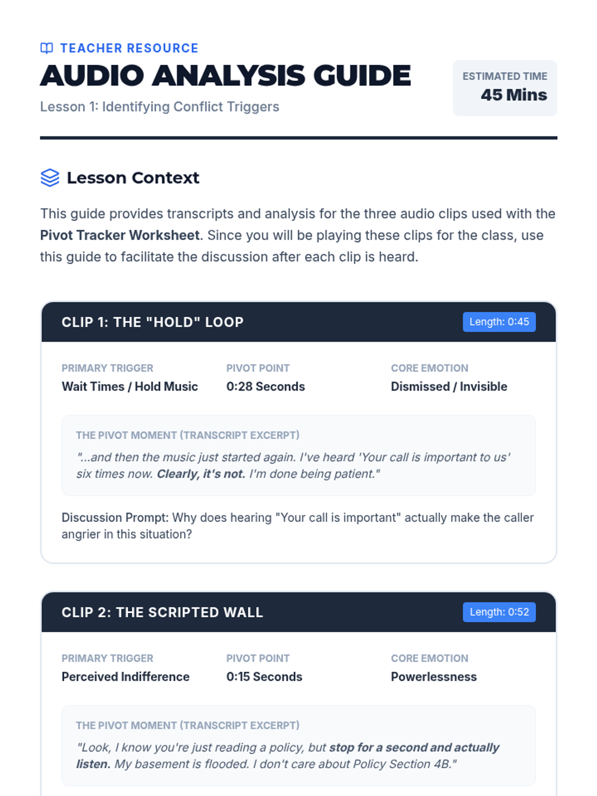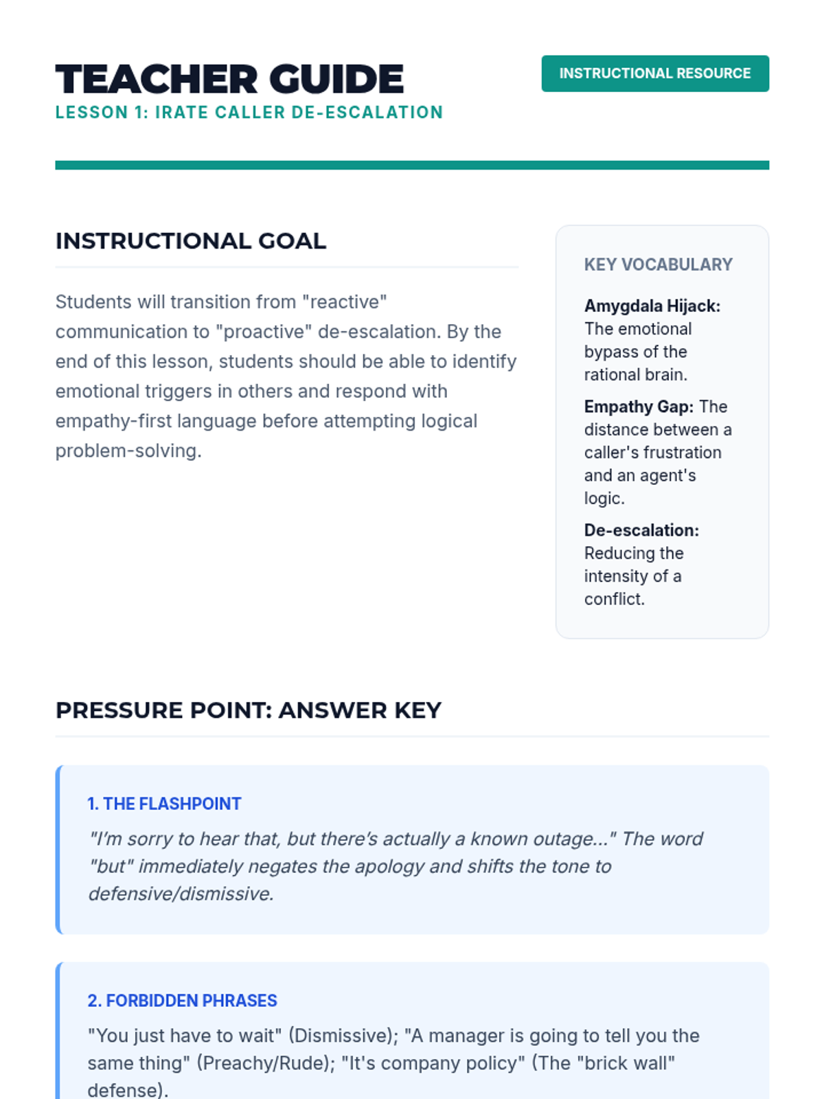 A comprehensive unit for 9th-grade students on navigating difficult phone interactions. Students explore conflict triggers, de-escalation techniques, communication barriers, and professional resilience to build a toolkit for maintaining professionalism under pressure.