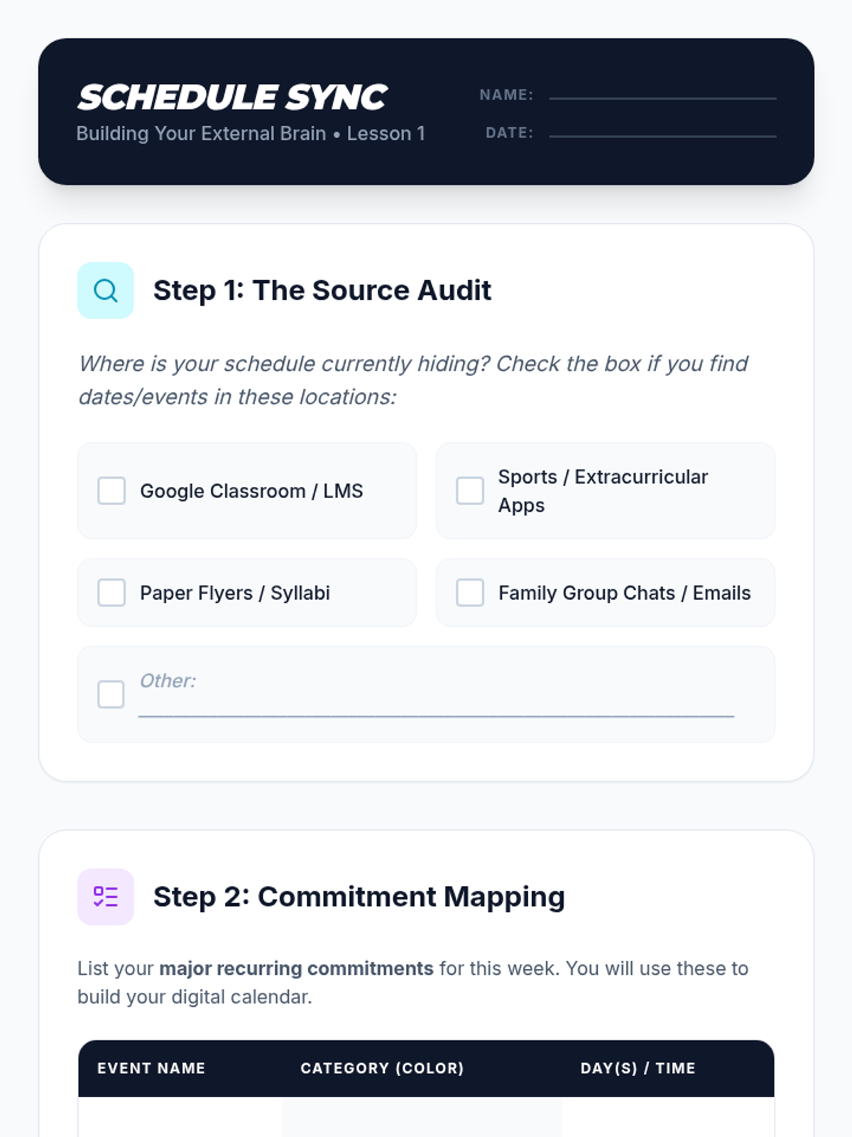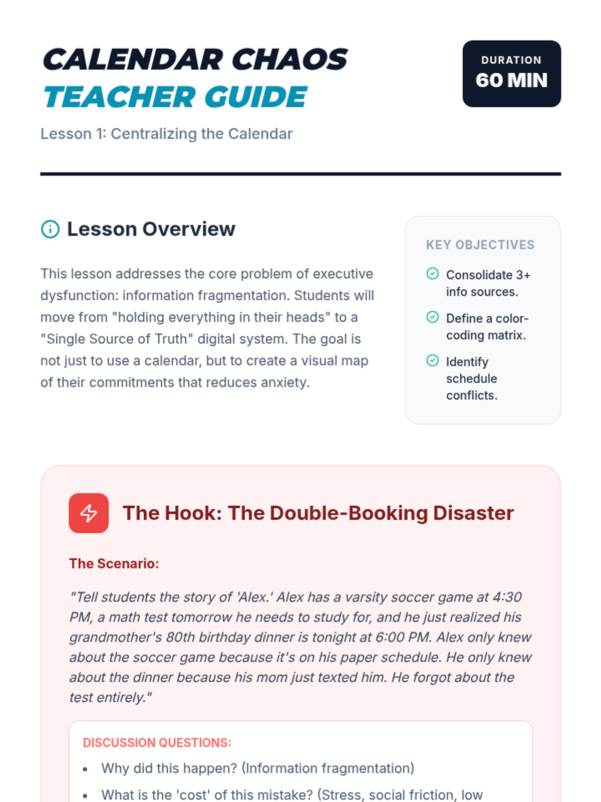 A 10th-grade sequence focused on building a digital ecosystem to manage multiple commitments. Students learn to use calendars, reminders, file management, and distraction-blocking tools to reduce cognitive load and improve organizational compliance.