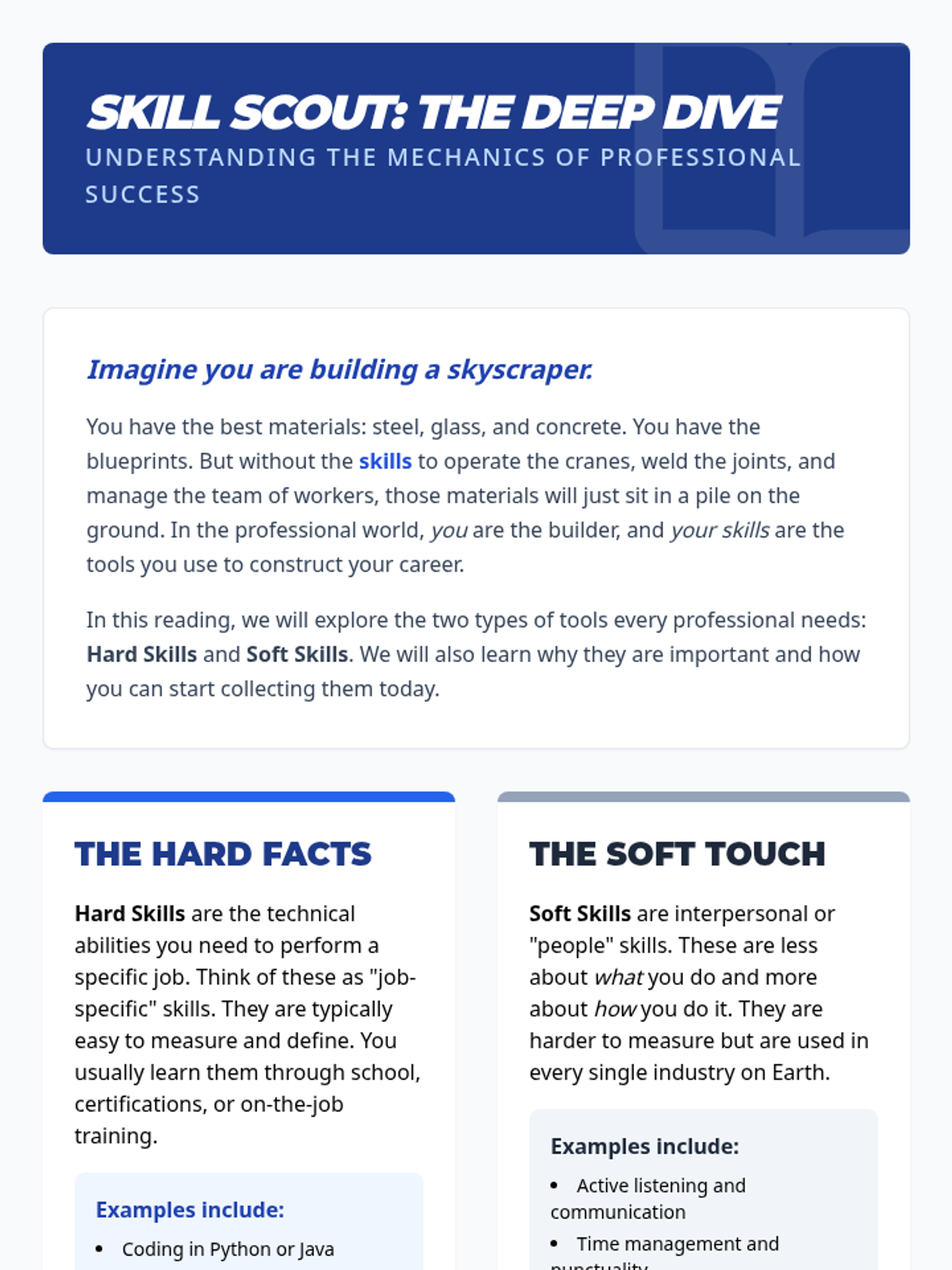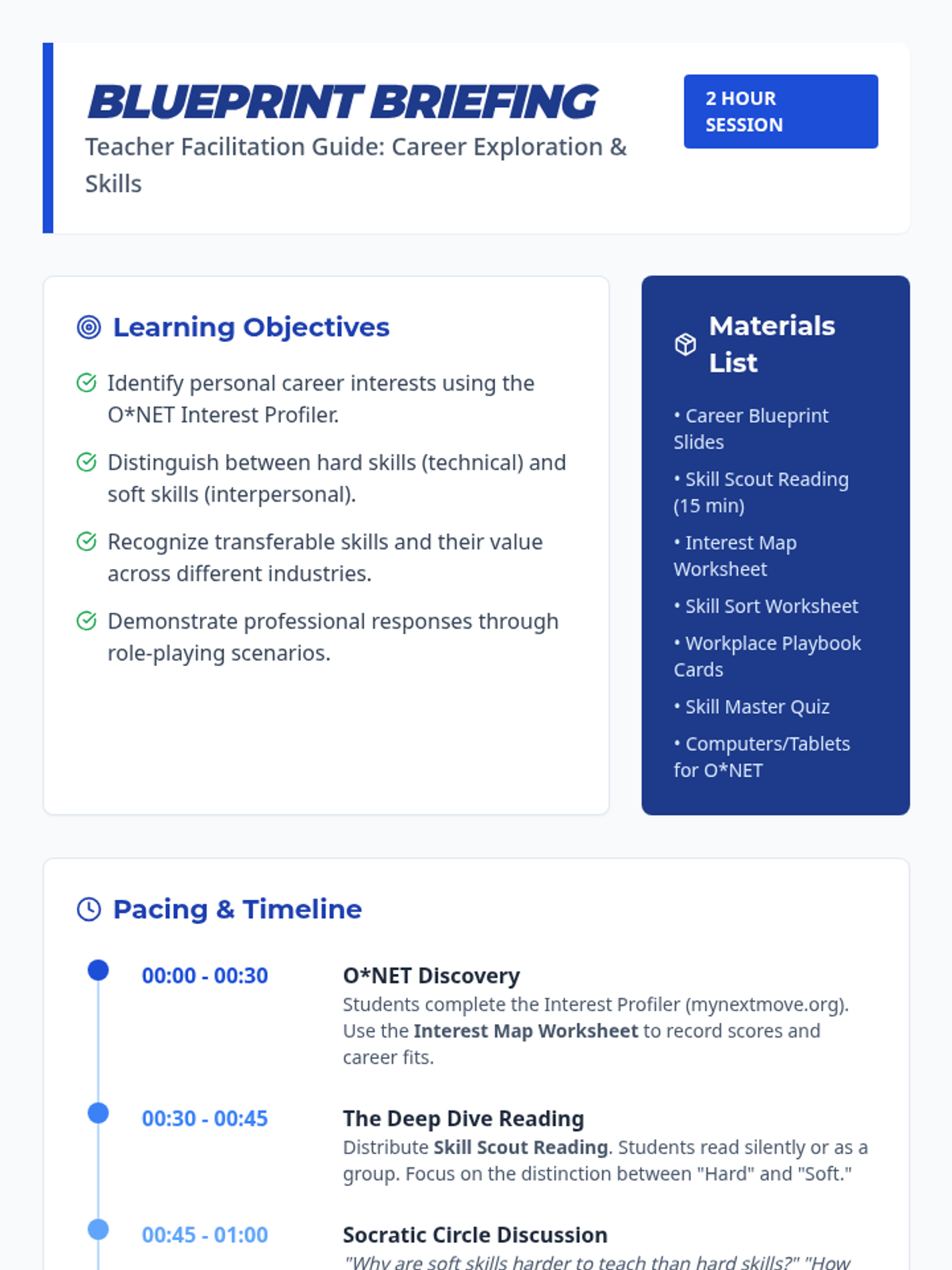 A comprehensive 2-hour lesson sequence focused on career exploration, starting with O*NET interest profiling and transitioning into an in-depth study of hard and soft skills. Students will explore skill definitions, transferability, and development through reading, role-play, and interactive activities.