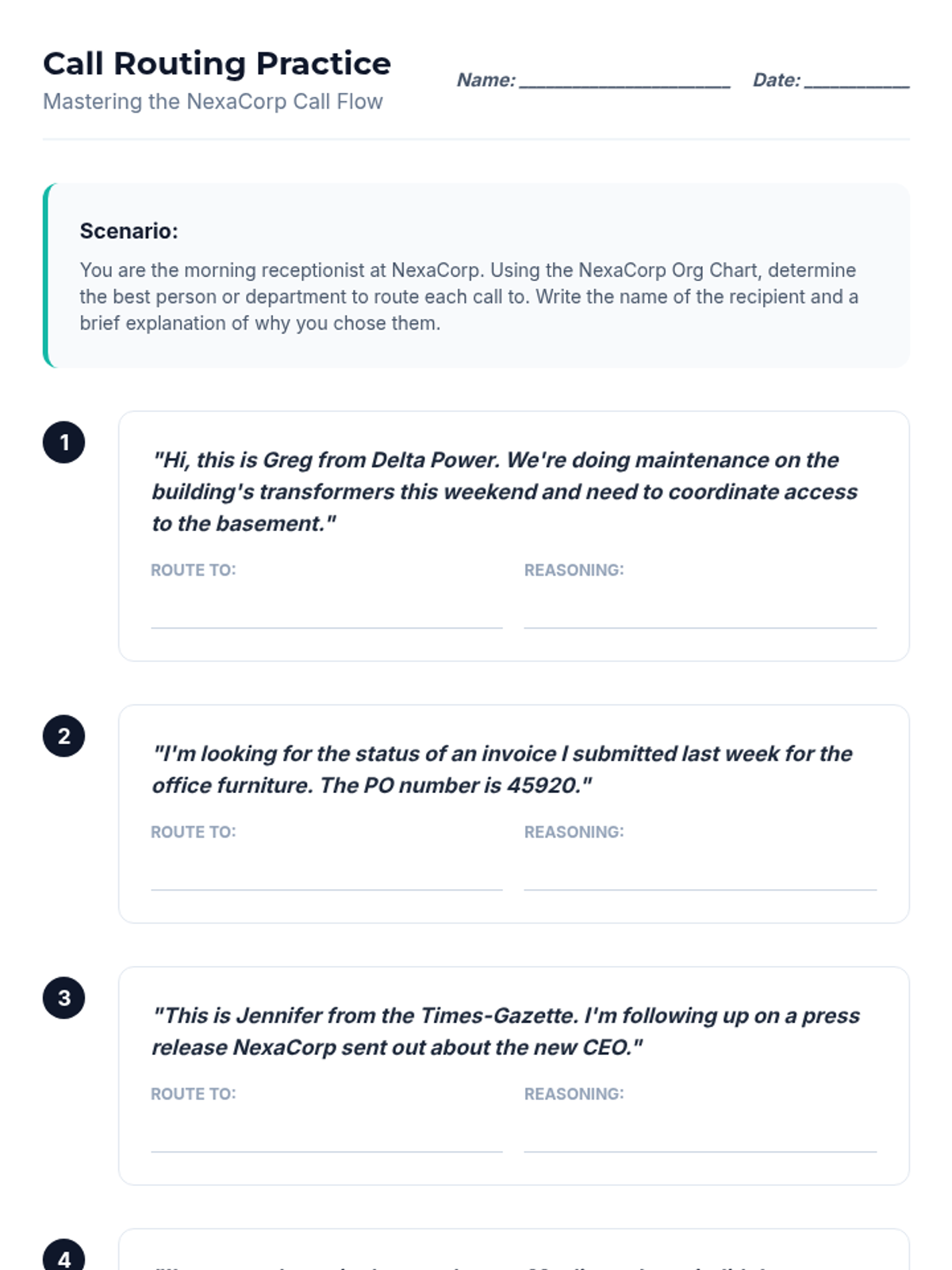 This sequence transforms students into professional communication experts through immersive simulations of office call flows. Students will master screening callers, executing polite holds and transfers, taking accurate messages, and managing multiple incoming lines with efficiency and courtesy.