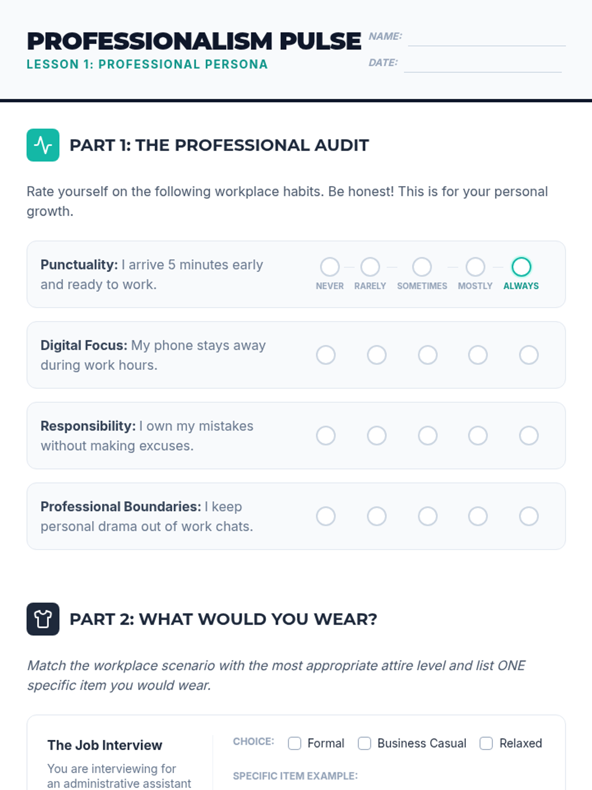 A comprehensive 3-hour one-on-one employment readiness curriculum designed for adults with disabilities. The sequence focuses on self-discovery, workplace etiquette, and practical application skills through engaging, accessible worksheets.