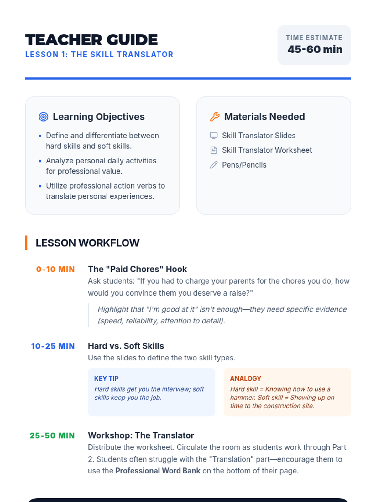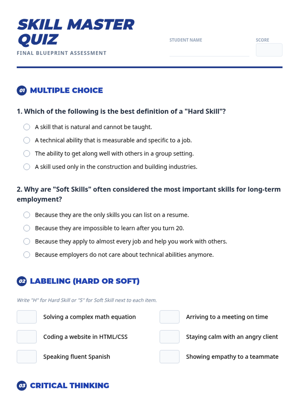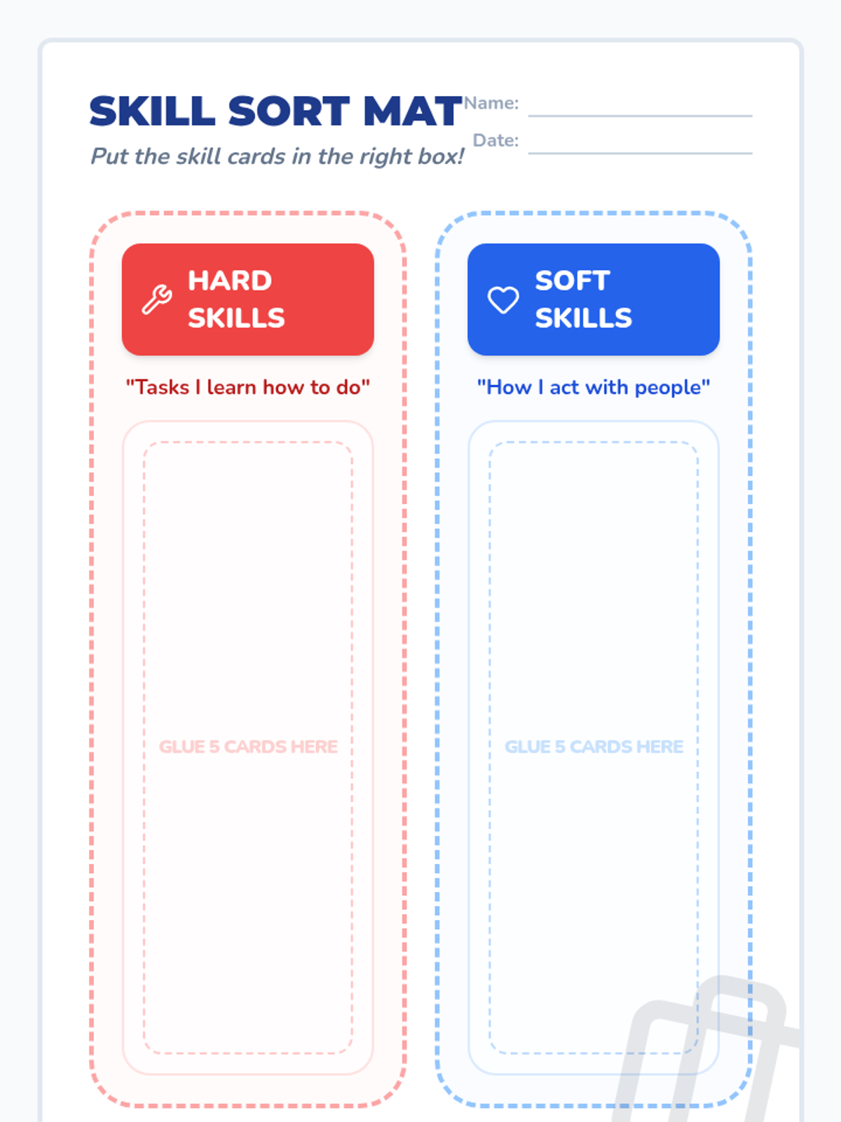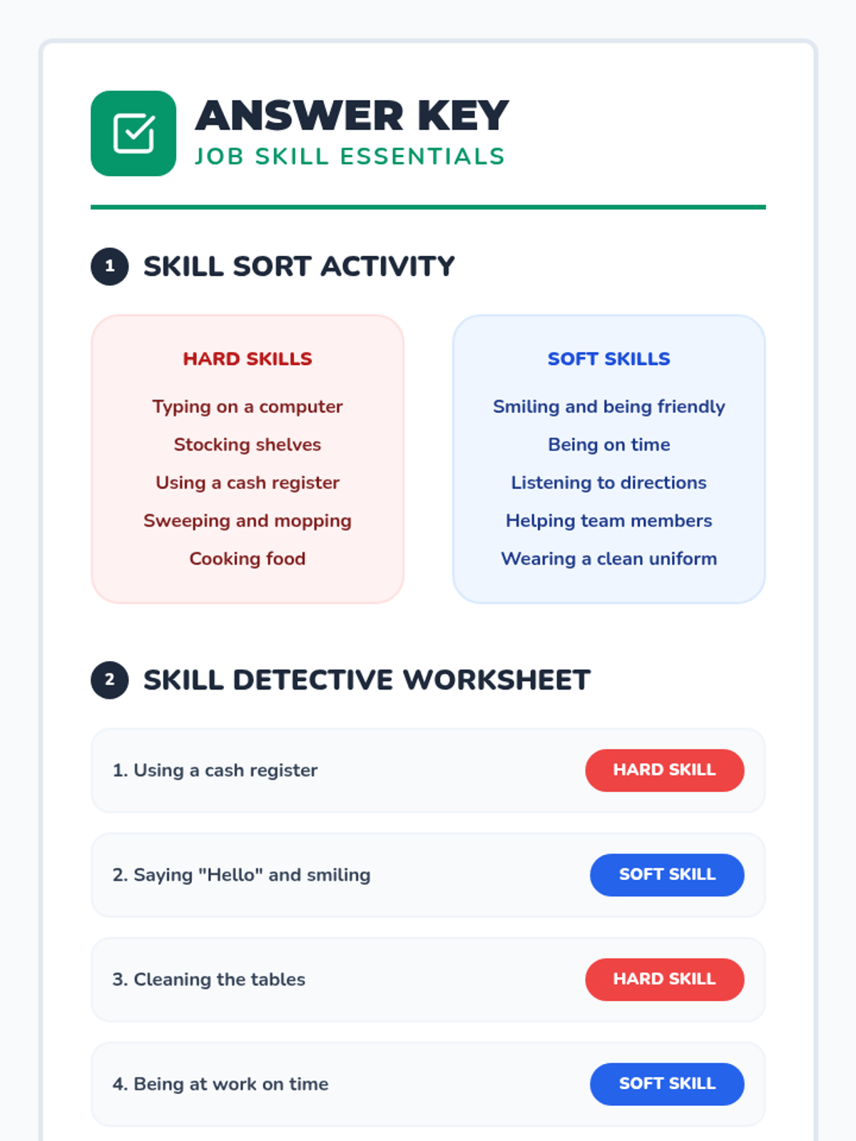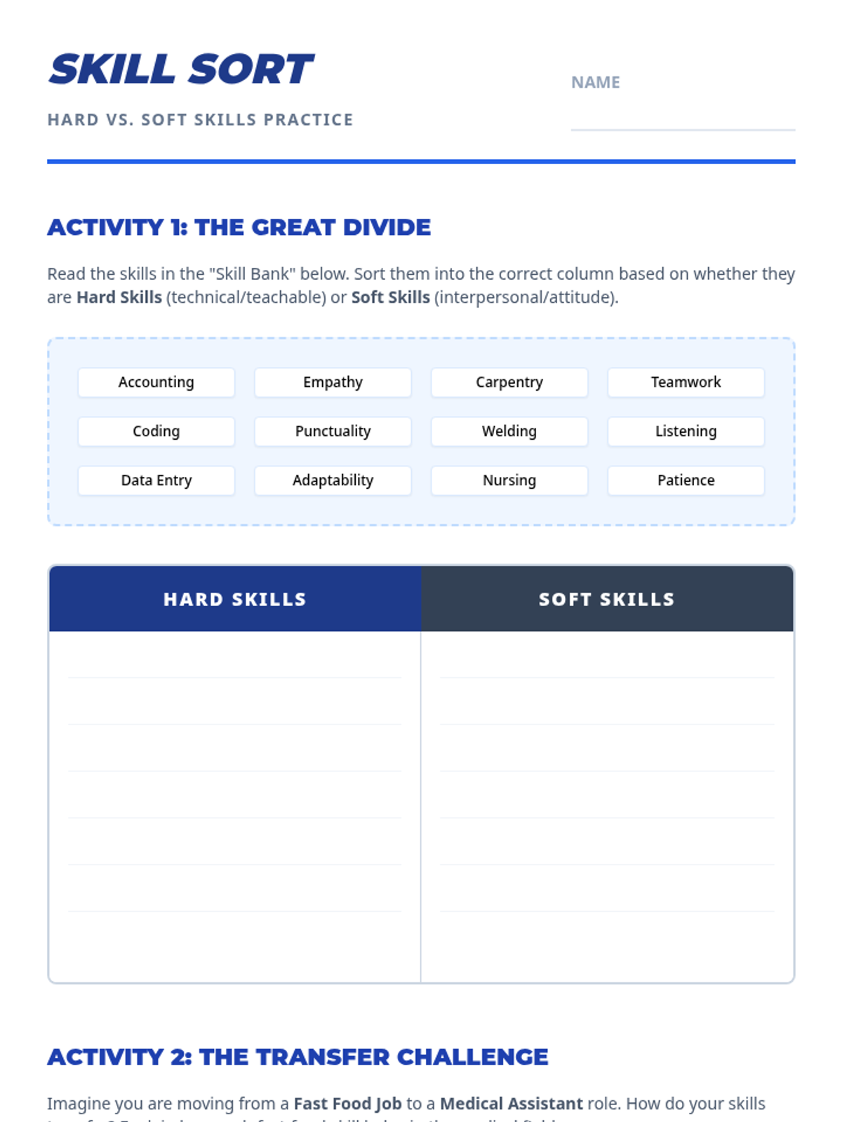 A comprehensive unit designed for high school life skills students with intellectual disabilities to distinguish between hard (technical) and soft (interpersonal) job skills through visual aids and interactive sorting activities.