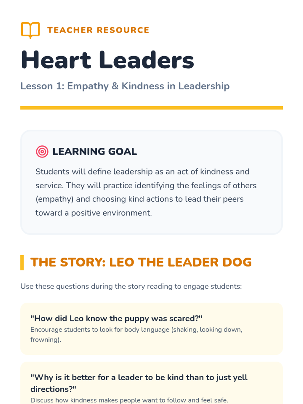 A five-lesson SEL sequence for K-1 students focused on leadership through the lens of empathy, initiative, teamwork, and communication. Students learn that being a leader means helping others, listening well, and working together.