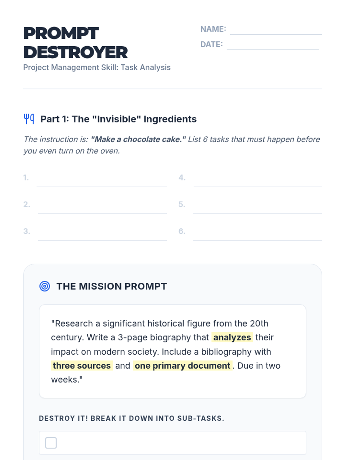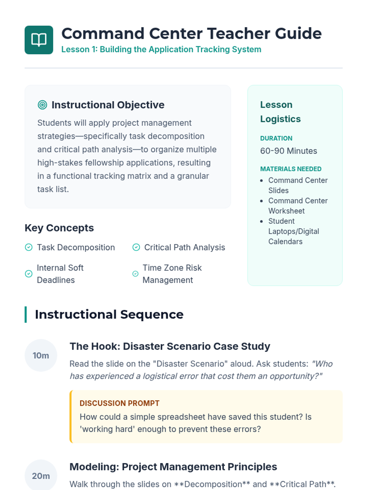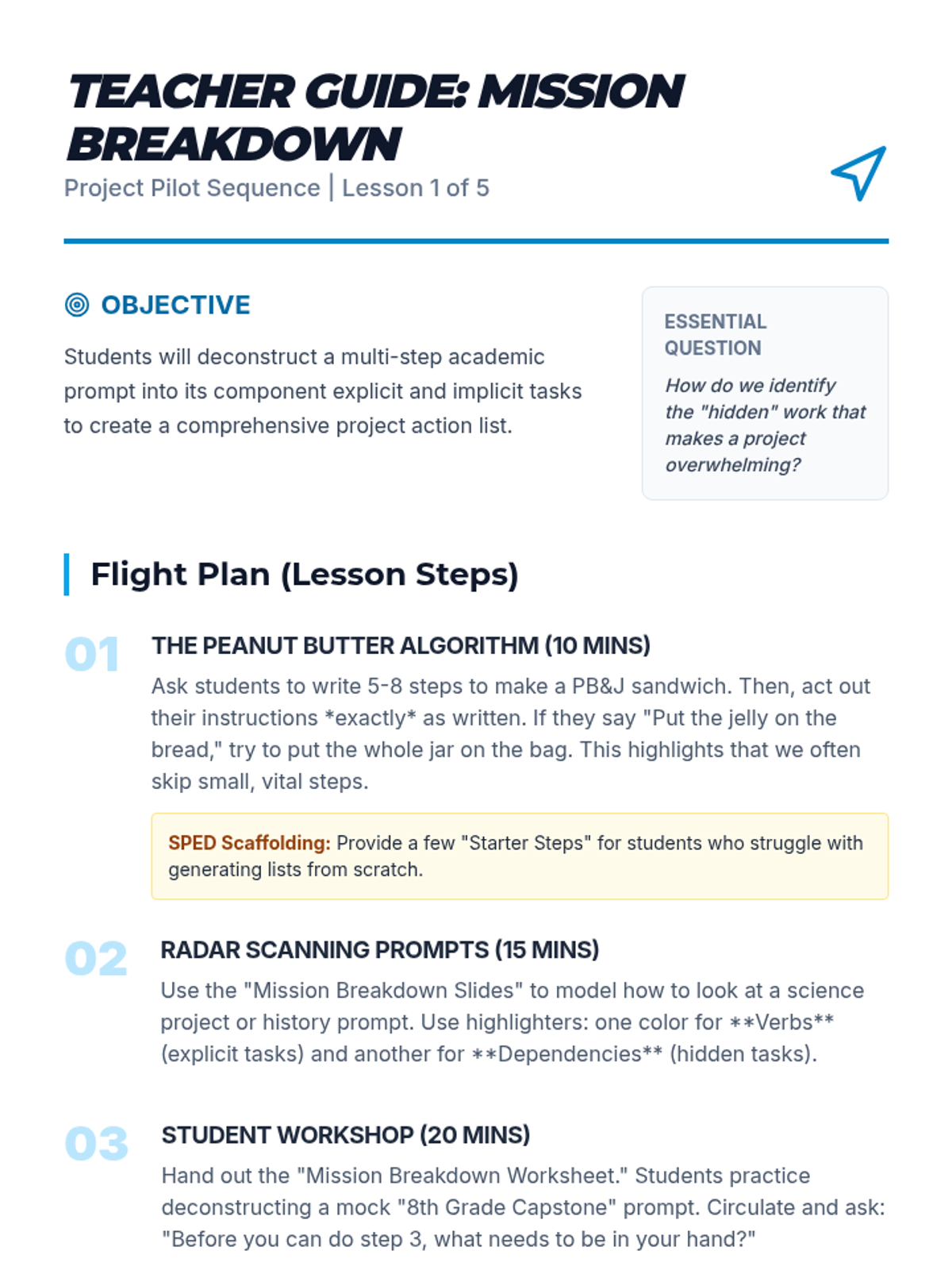 A specialized sequence for 8th-grade students focusing on executive functioning skills related to project management. Students learn to deconstruct complex assignments, plan backwards from deadlines, visualize overlapping tasks using Gantt charts, and adjust plans when setbacks occur.