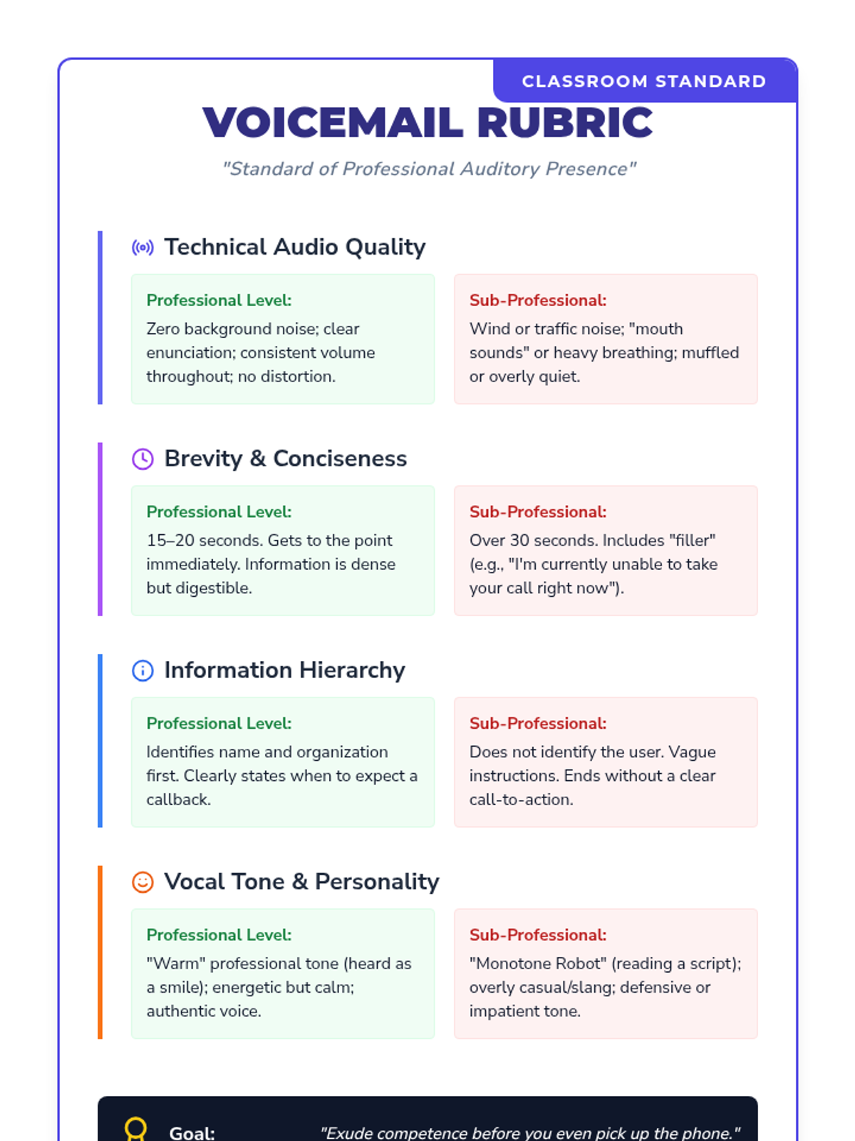A comprehensive 9th-grade sequence on professional asynchronous communication, focusing on voicemail greetings and messaging. Students analyze, script, record, and practice follow-up protocols to build a professional digital presence.