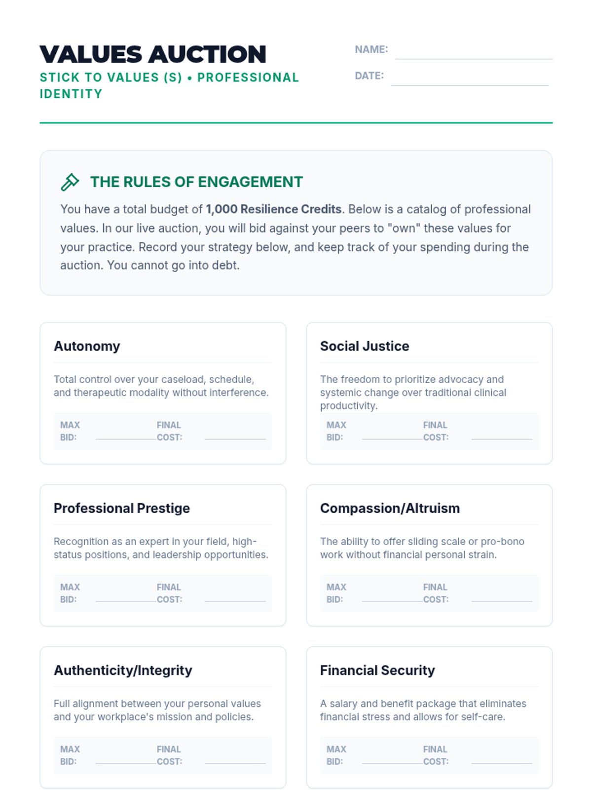 A graduate-level sequence focused on applying FAST skills (Fair, Apologies, Stick to Values, Truthful) to professional identity, boundary setting, and therapist resilience. Students learn to navigate imposter syndrome, ethical documentation, and career advocacy through a clinician-centered lens.