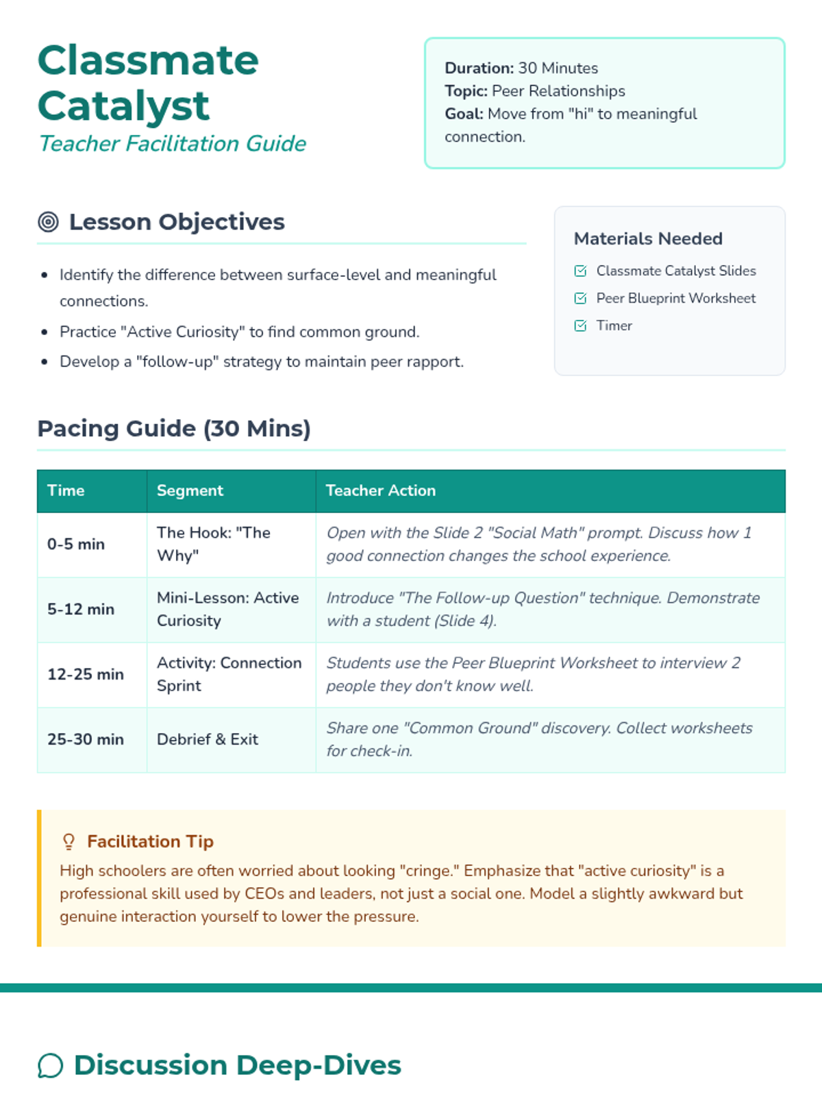 A specialized collection of social navigation guides and visual protocols designed for high school students to master professional routines, interpersonal boundaries, and active engagement in academic and vocational settings.