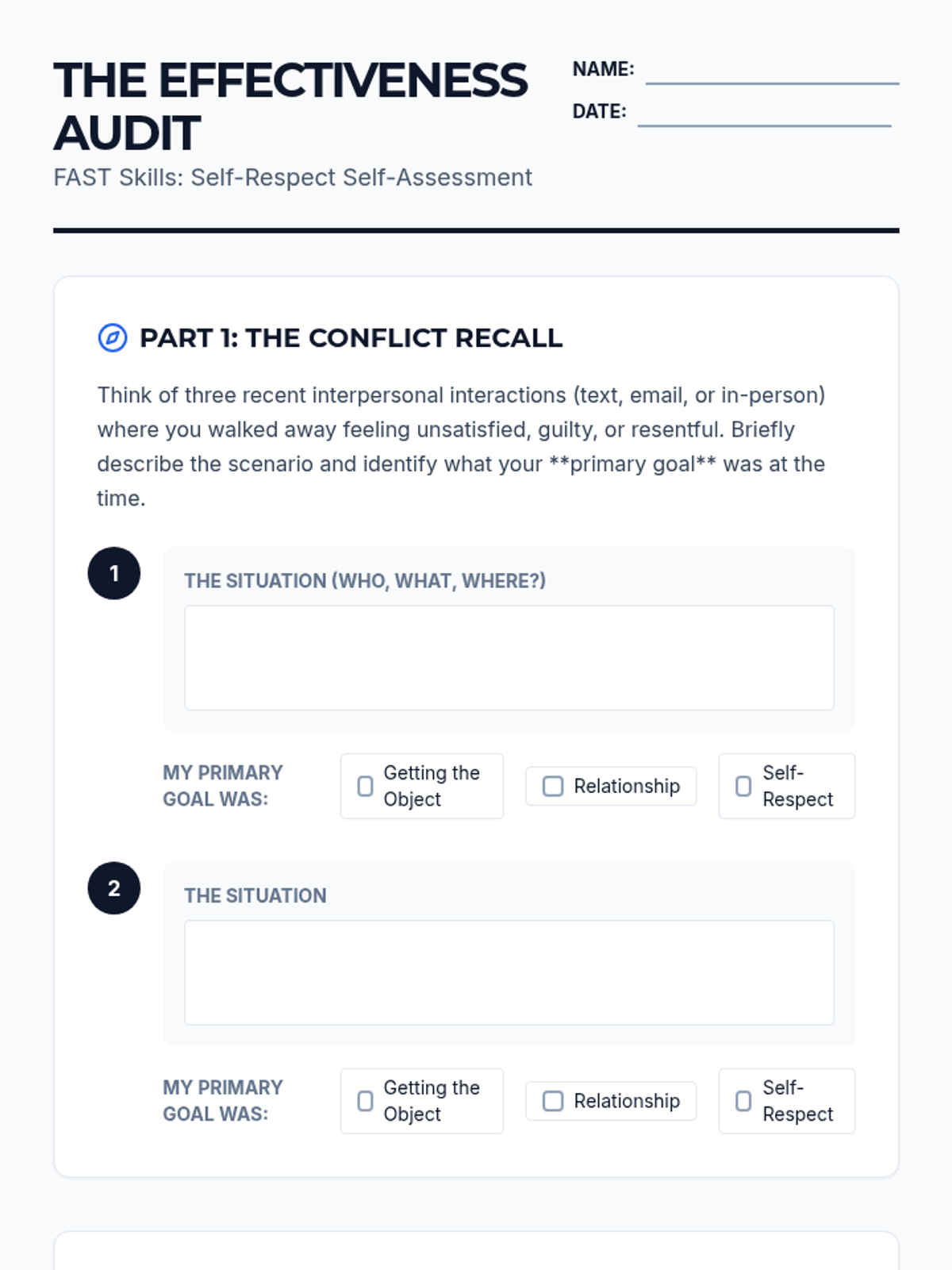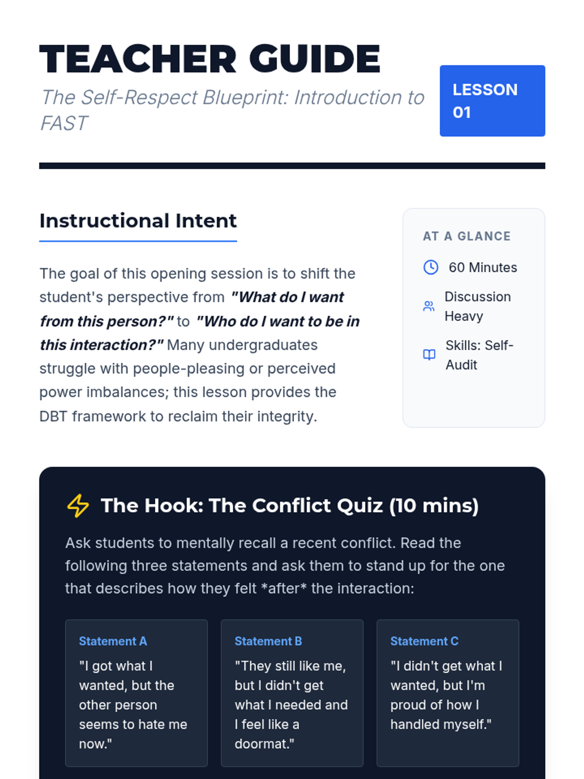 A comprehensive 5-lesson series for undergraduate students on the Dialectical Behavior Therapy (DBT) FAST skills. Students explore Fairness, Apologies, Sticking to Values, and Truthfulness to build a foundation for maintaining self-respect in social and professional contexts.