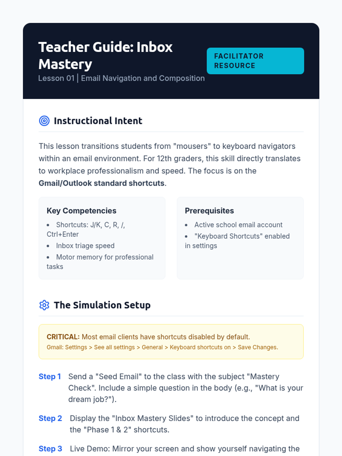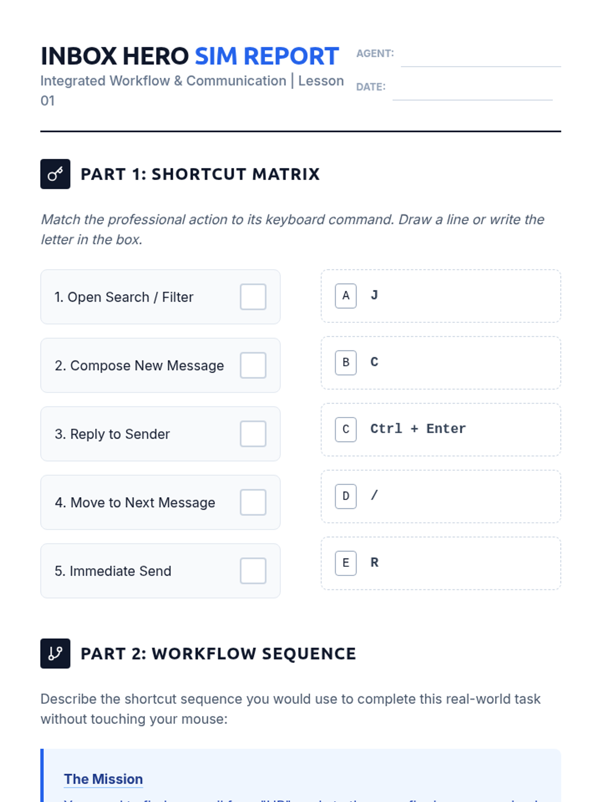 An advanced sequence for 12th-grade students focused on integrating keyboard shortcuts into professional communication and workflow. Students master email, calendar management, and cross-application data transfer using assistive technology and efficiency strategies.