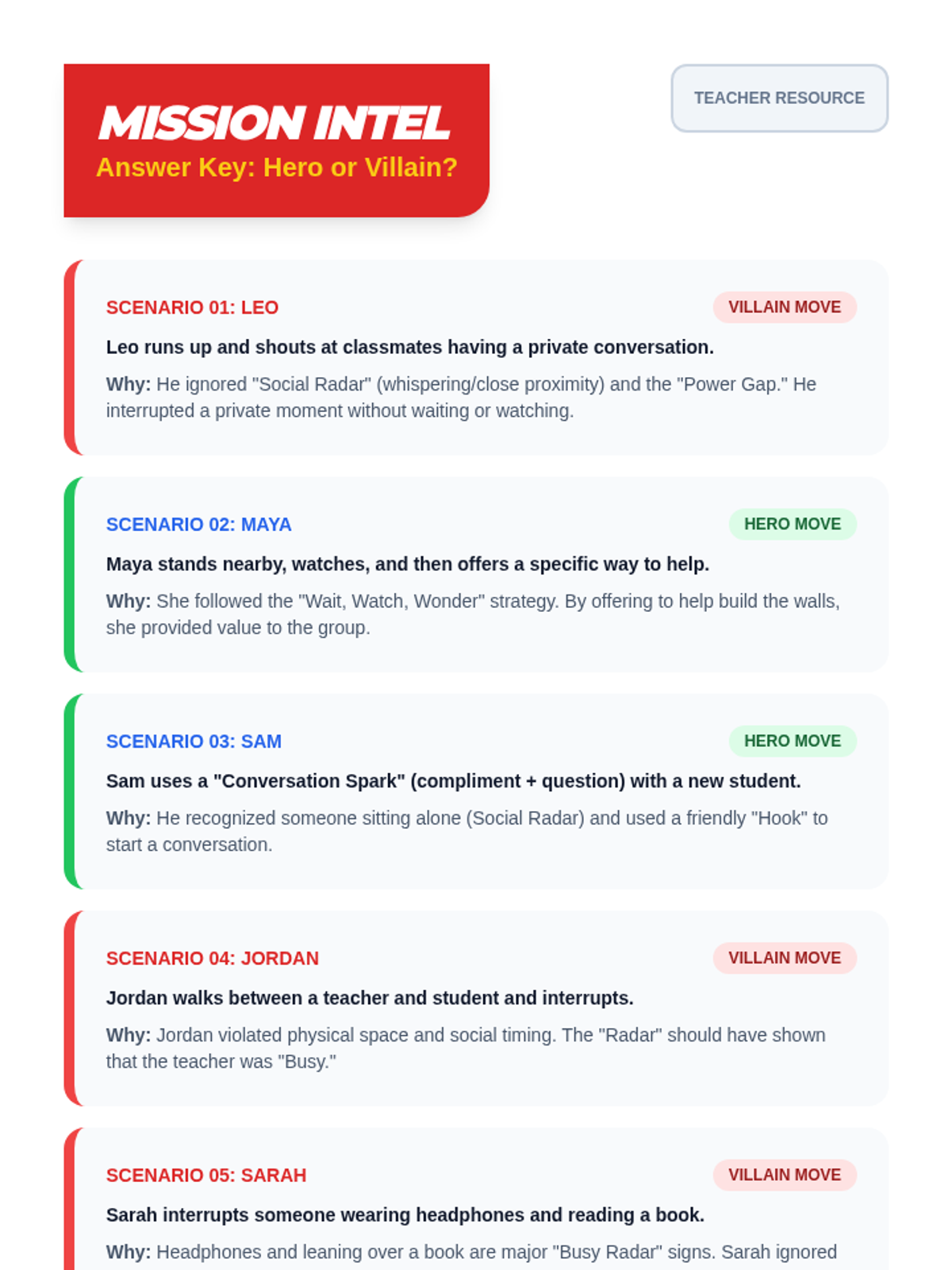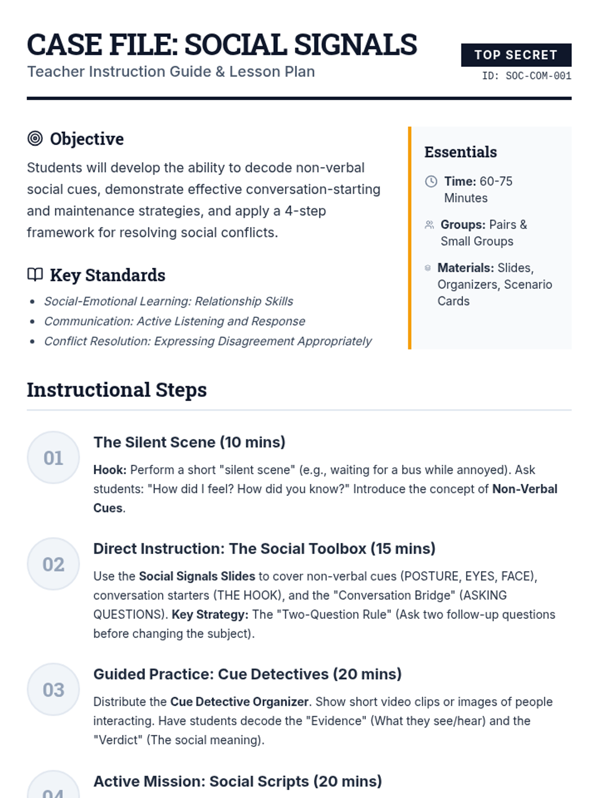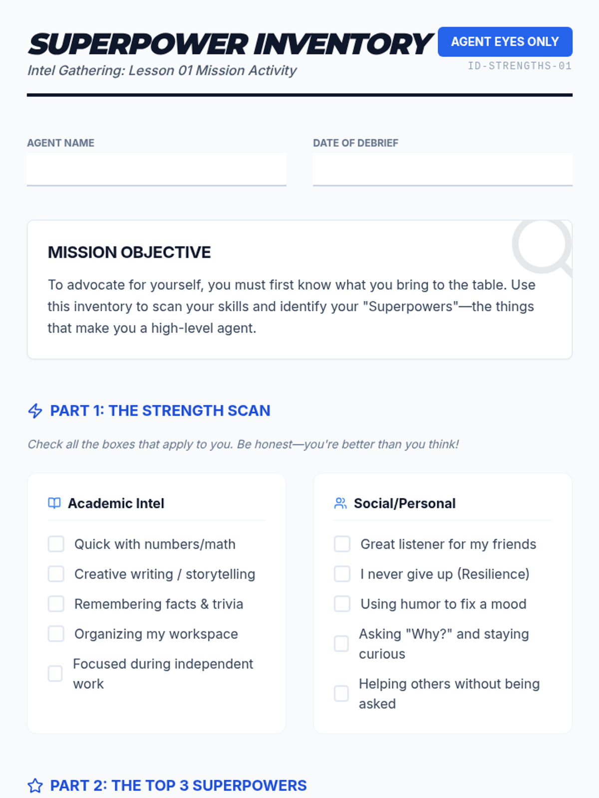 A series of high-impact, 15-minute mini-lessons designed to build essential classroom culture skills through a secret agent lens. From working independently to active listening, students train to become 'Elite Agents' in their learning community.