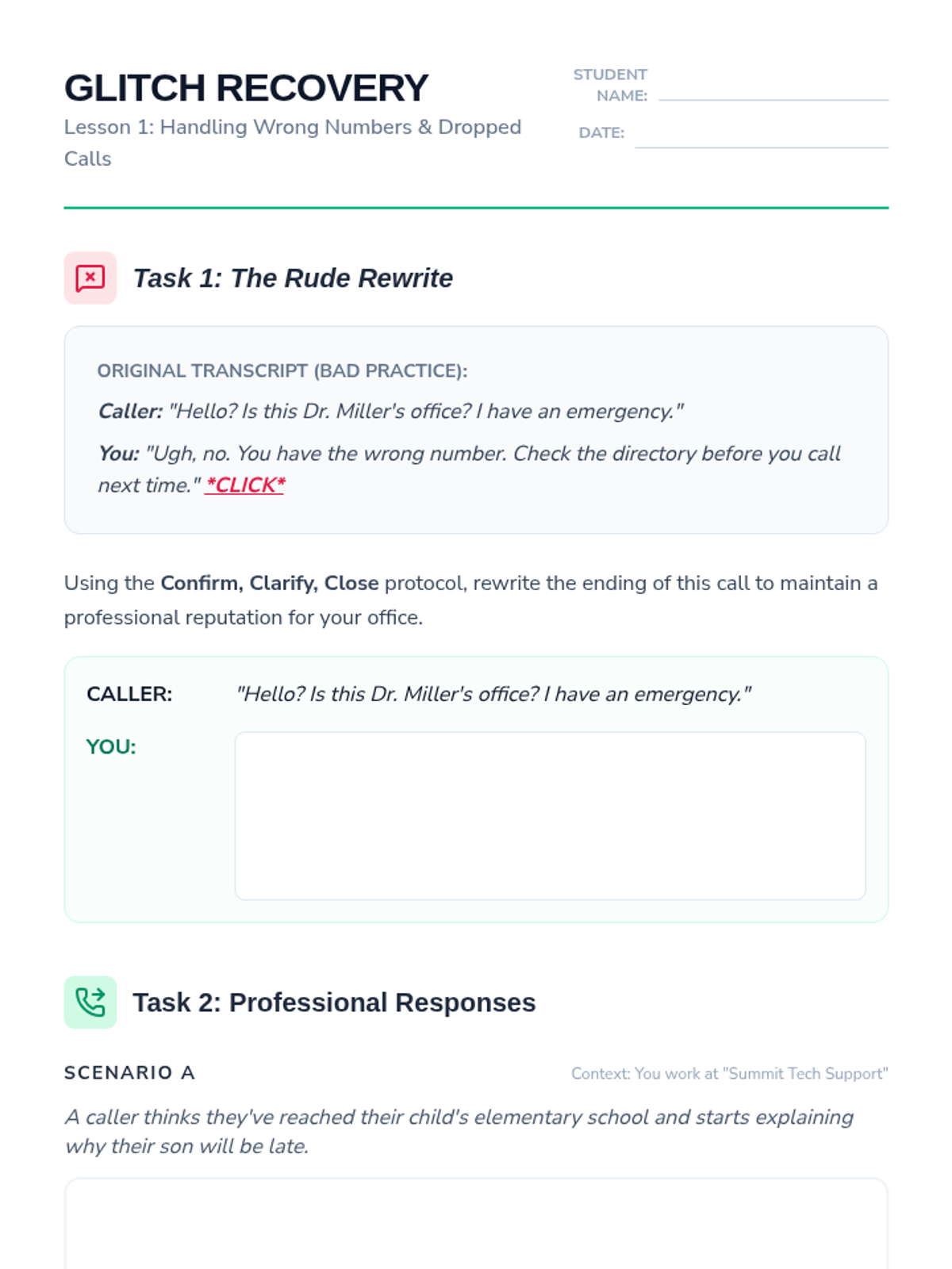 This sequence prepares 7th-grade students for non-standard phone interactions, focusing on problem-solving, de-escalation, and professional etiquette in complex telephonic scenarios. Students move from basic technical issues like wrong numbers to managing high-stress interpersonal friction.