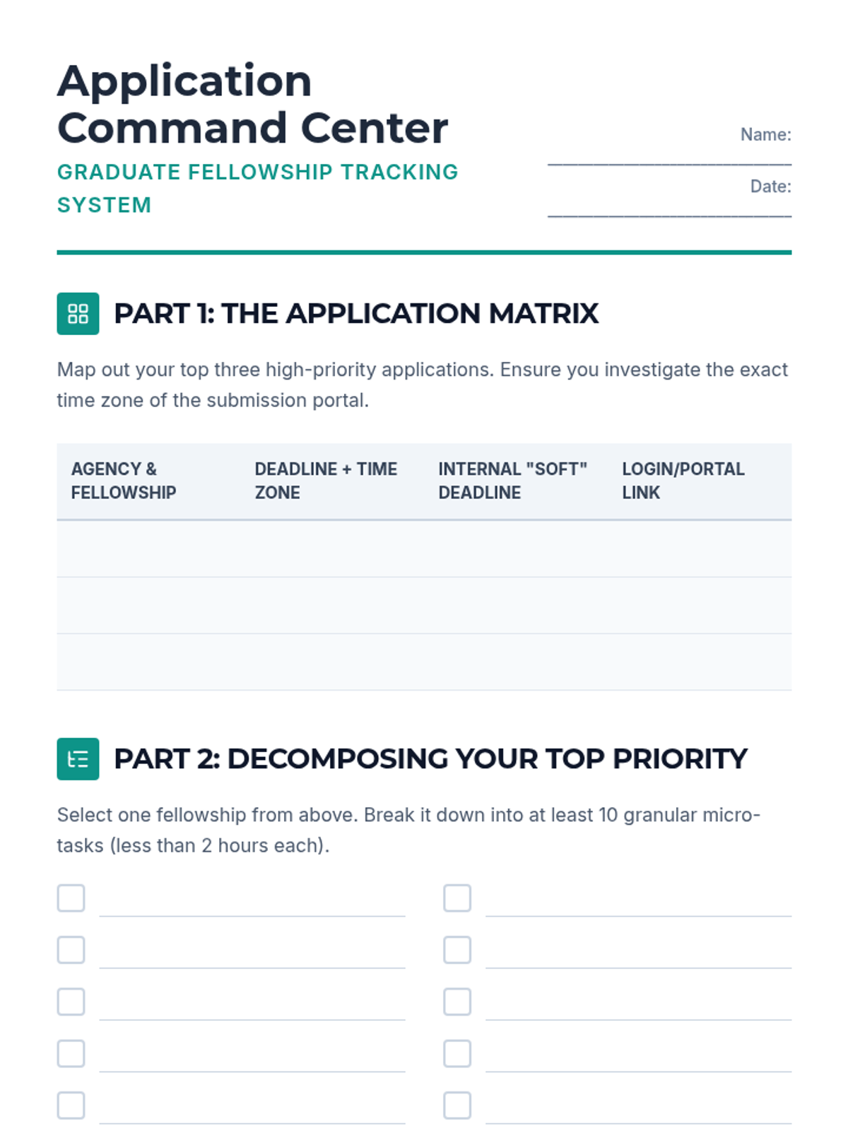 A comprehensive graduate-level sequence focused on the professional project management of fellowship and scholarship applications. Students learn to build tracking systems, manage recommenders strategically, curate funding-specific CVs, and ensure quality control for final submissions.