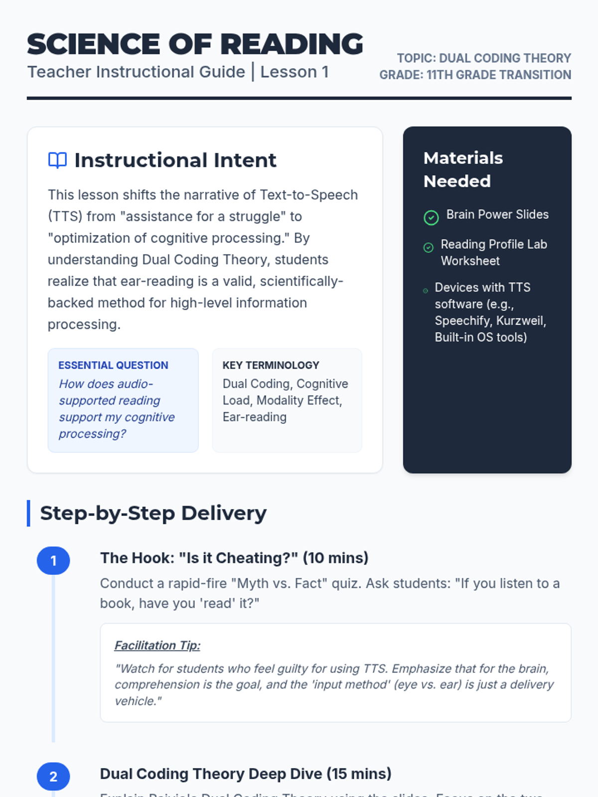 A comprehensive sequence for 11th-grade students focusing on the metacognitive and self-advocacy skills needed for using Text-to-Speech (TTS) technology in post-secondary environments. Students investigate cognitive science, legal frameworks, and practical communication strategies to ensure accessibility in college and career.