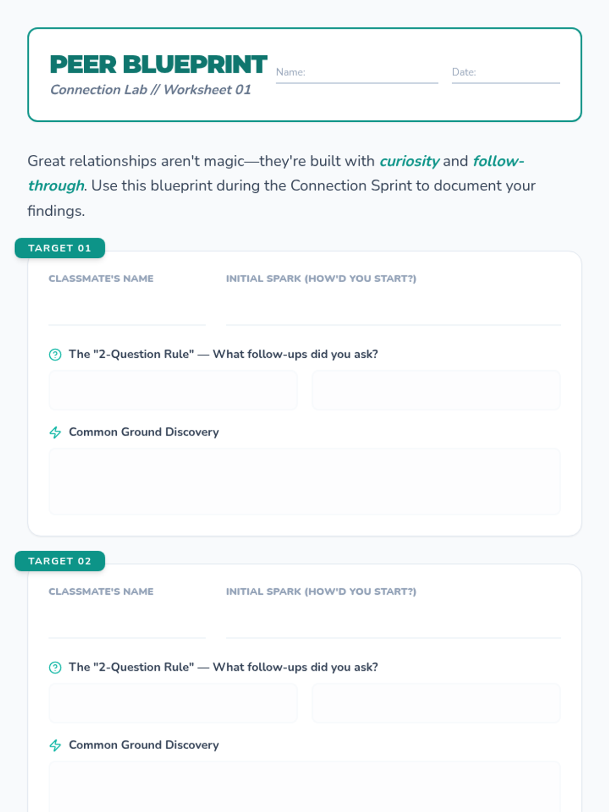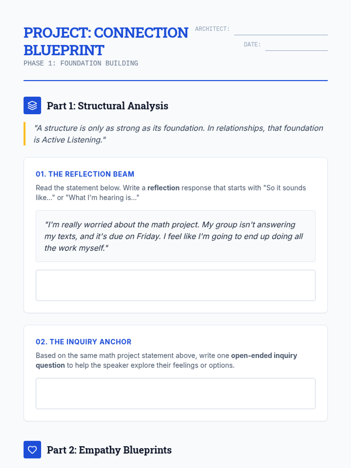 A series of 30-minute workshops designed for high schoolers to develop authentic relationships with peers and professional connections with teachers through active listening, self-advocacy, and boundary setting.