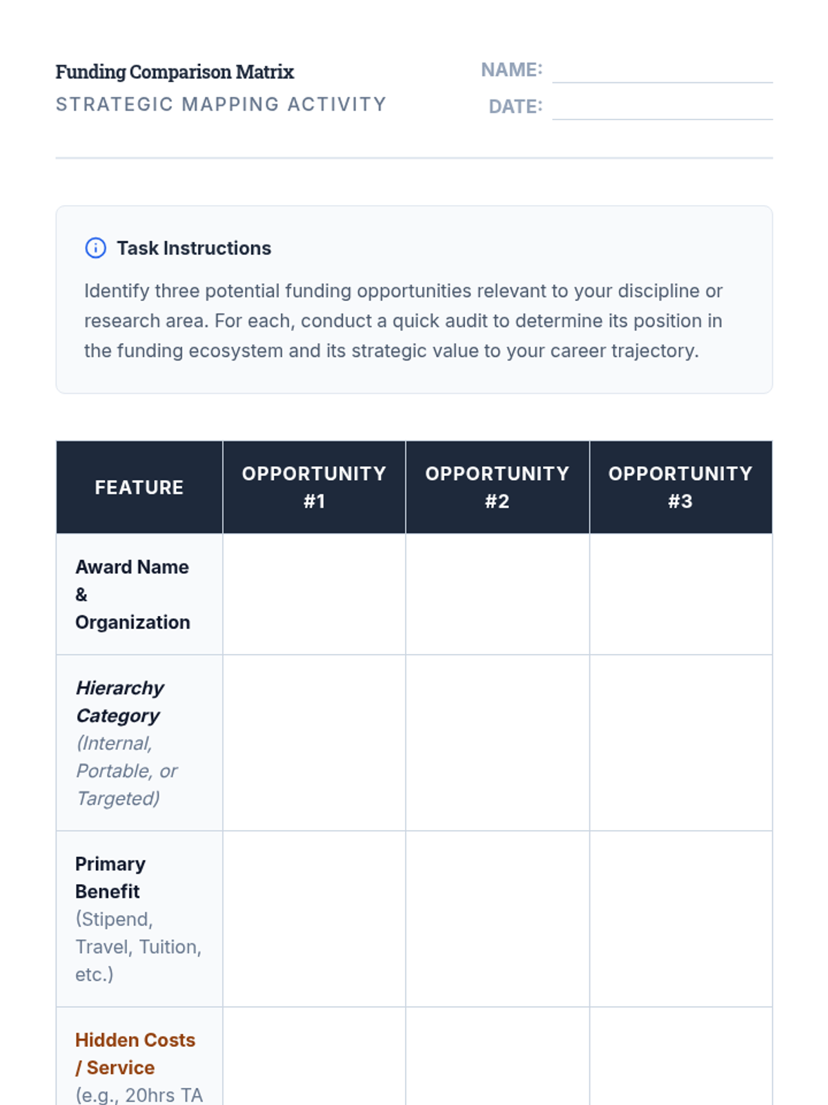 A comprehensive sequence for graduate students to navigate the complex landscape of advanced degree funding, including fellowships, grants, and assistantships. Students will learn to analyze funder missions, leverage niche databases, and build a strategic 12-month funding roadmap.