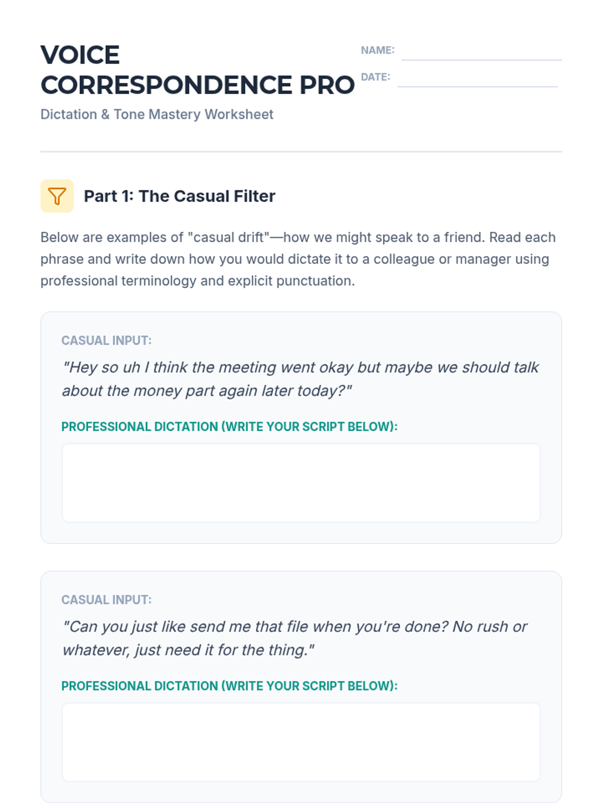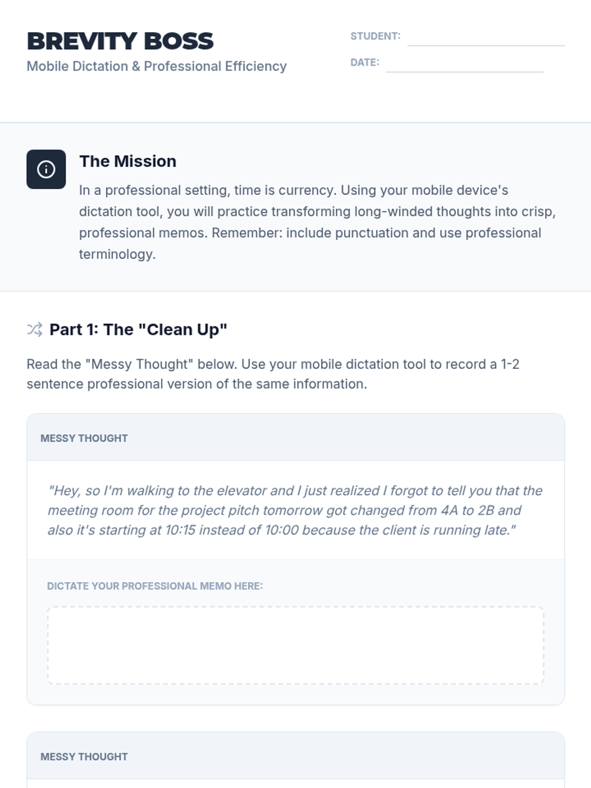 A career-readiness unit for 12th-grade students using assistive technology to master professional written communication through dictation. Students learn to code-switch from casual speech to formal writing, use voice commands for complex formatting, and edit for business conciseness.