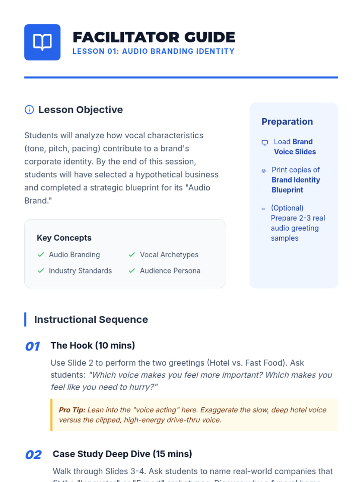 Students step into the role of corporate communication architects to design audio brand identities, professional voicemail systems, and efficient call flow structures. This sequence bridges technical writing, user experience (UX) design, and professional speaking through a project-based approach.