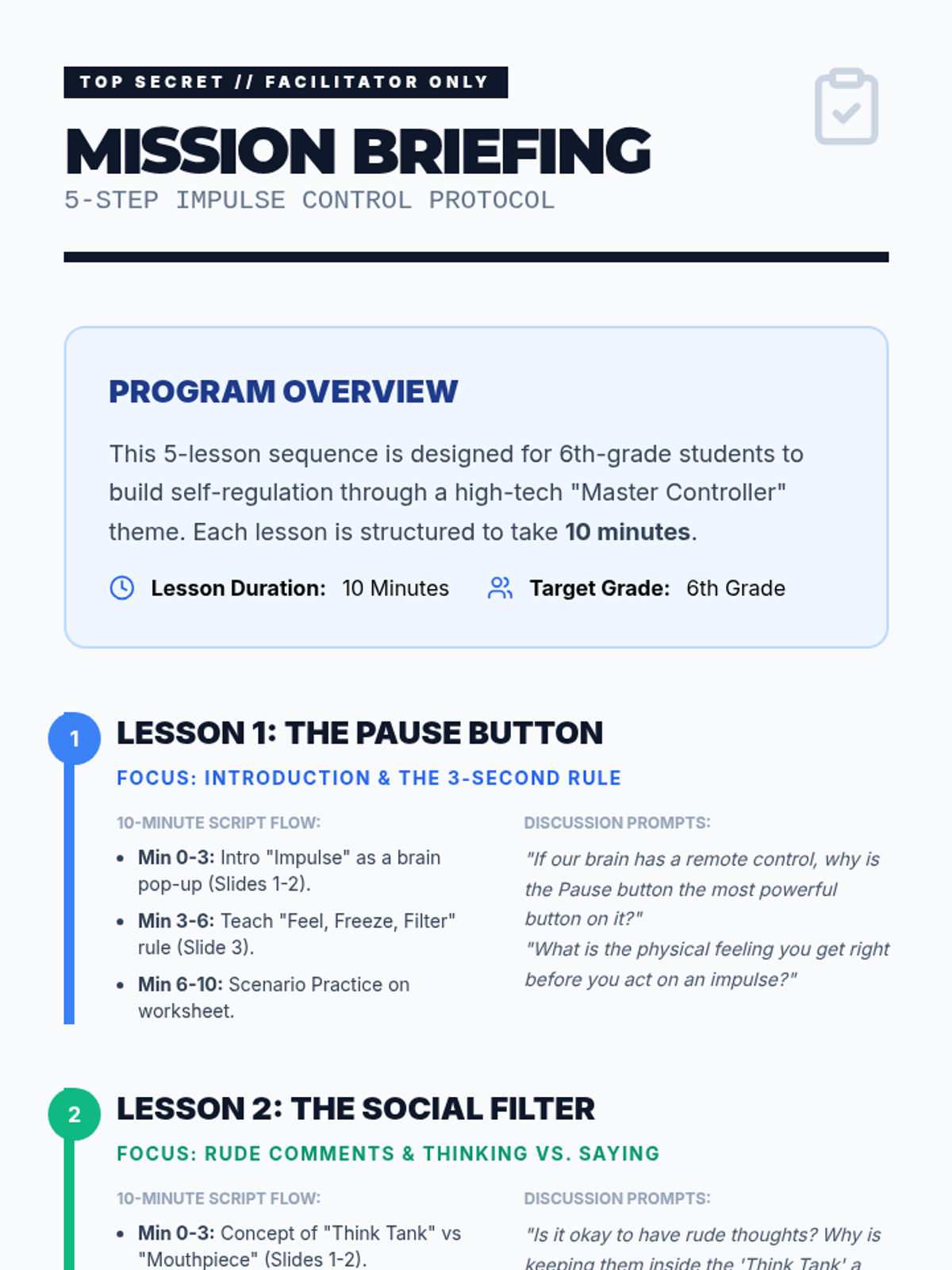 A 5-lesson series for 6th graders focused on developing impulse control, social filters, and respectful communication through a 'Master Controller' theme.