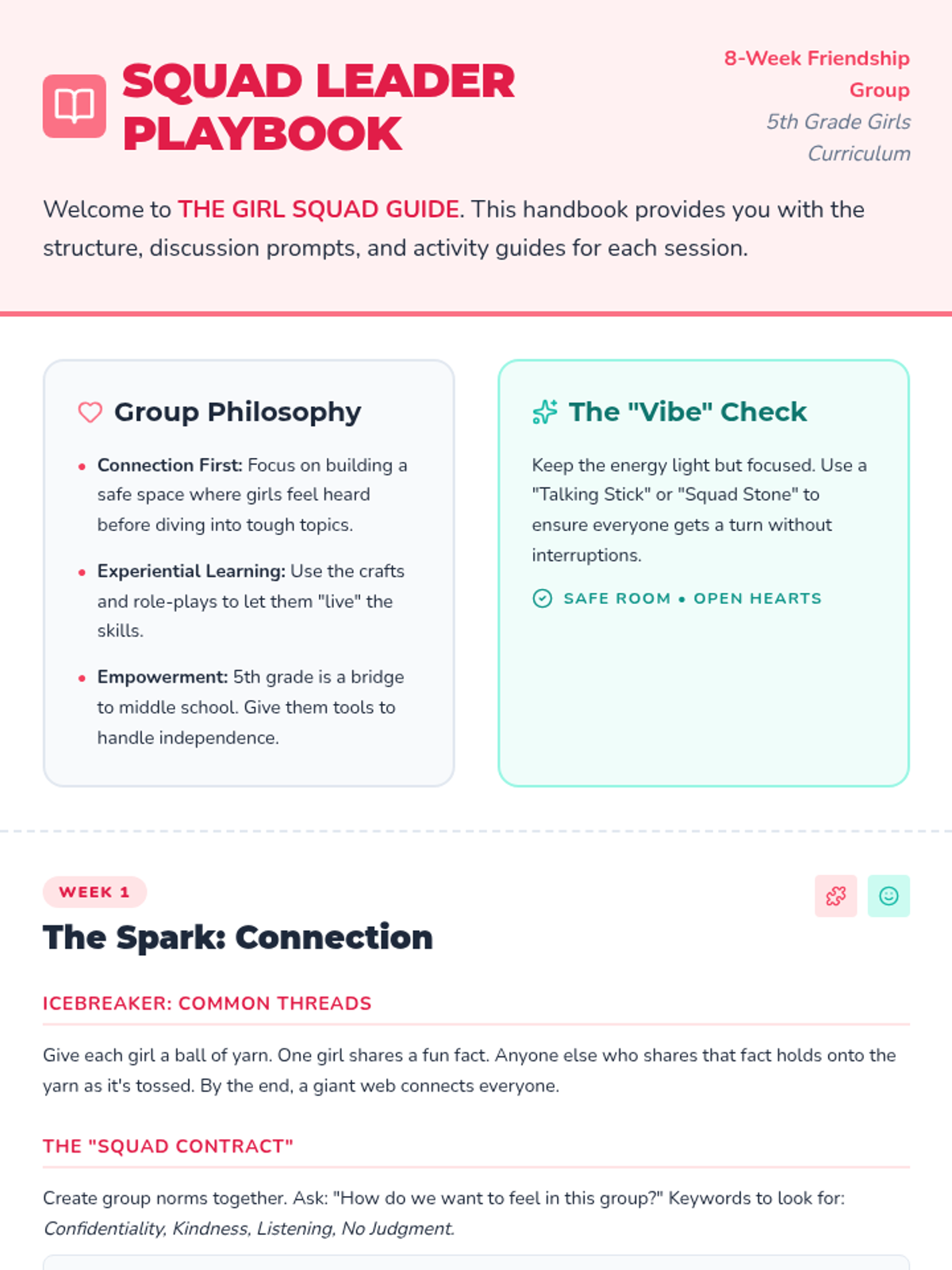 An 8-week small group curriculum for 5th-grade girls focused on building healthy friendships, mastering communication, and navigating conflict through discussion, crafts, and reflection.