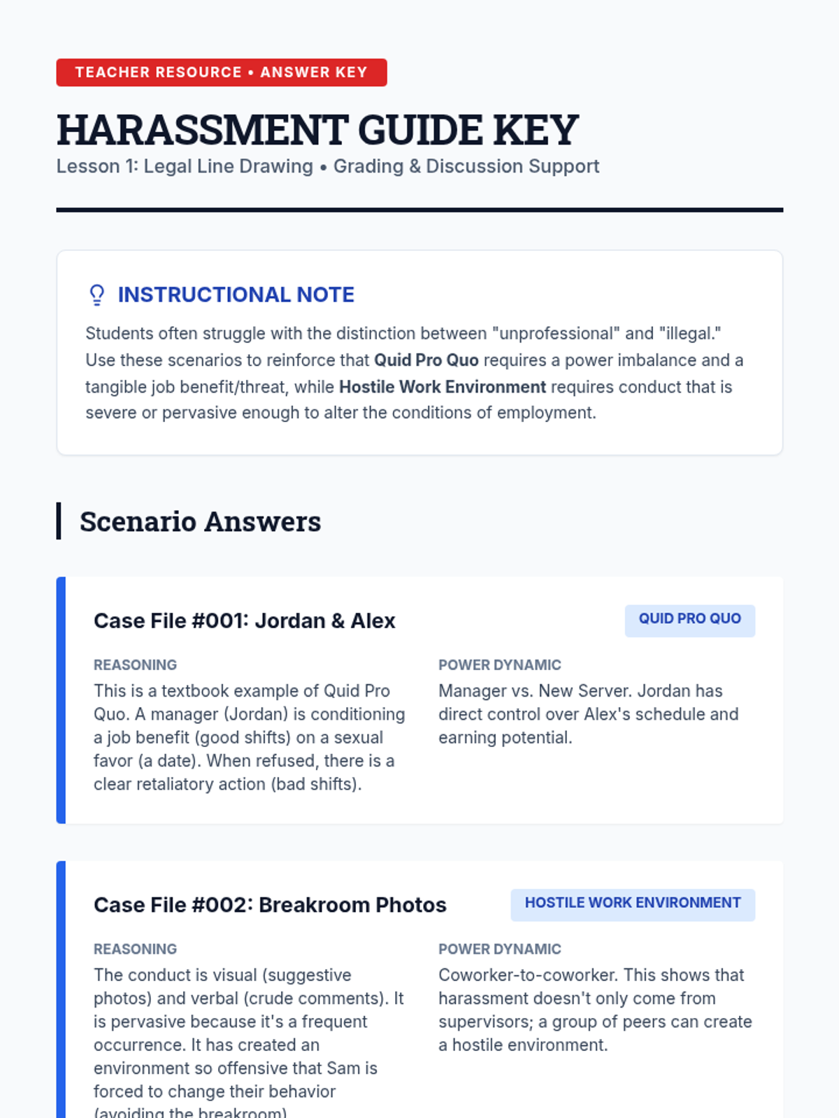 A comprehensive unit for 10th graders on identifying, distinguishing, and responding to workplace harassment. Students explore the legal definitions of 'quid pro quo' and 'hostile work environment' while investigating the nuances of intent versus impact.
