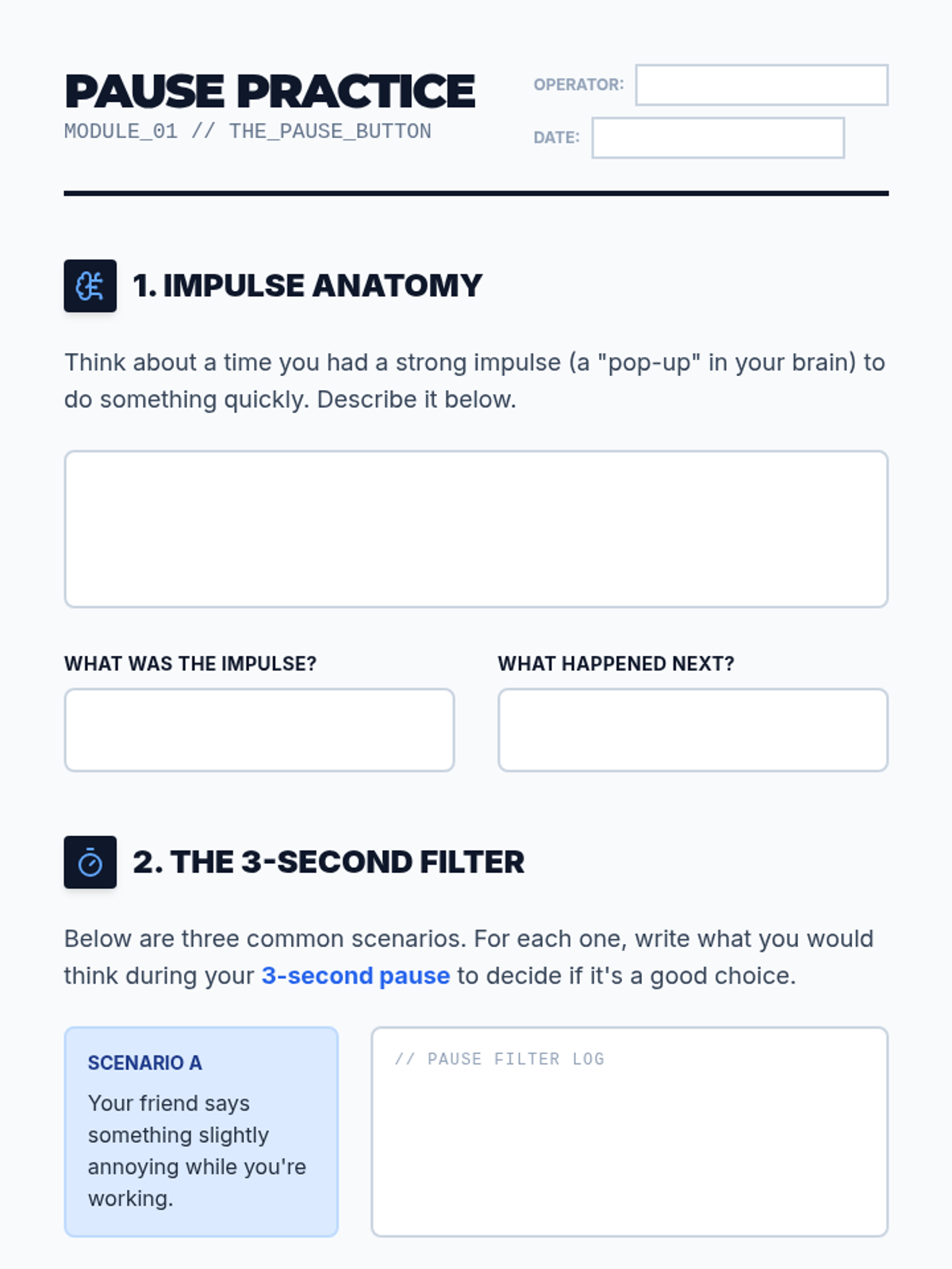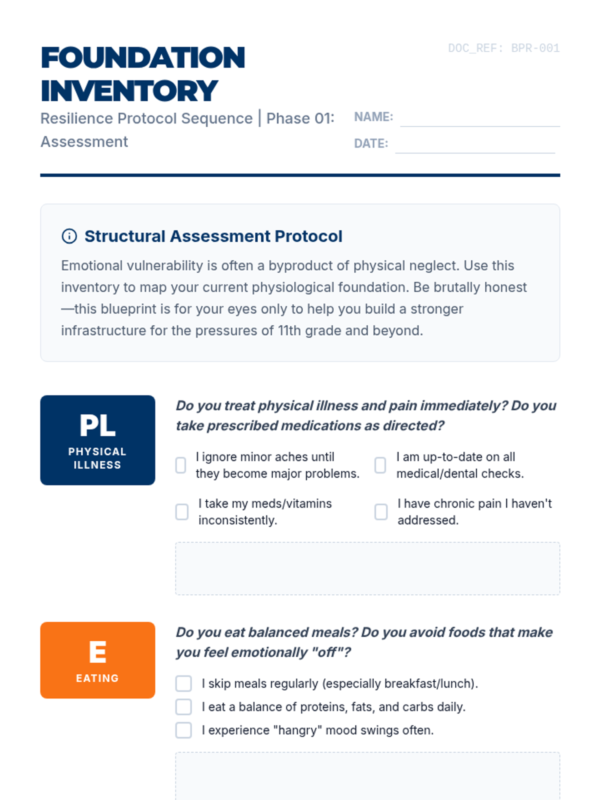 A 4-week counseling series for high school seniors focused on emotional literacy and expression. Using a 'Personal Blueprint' theme, the sequence treats emotions as data points and internal systems to help remove the stigma of sensitivity and focus on self-mastery.