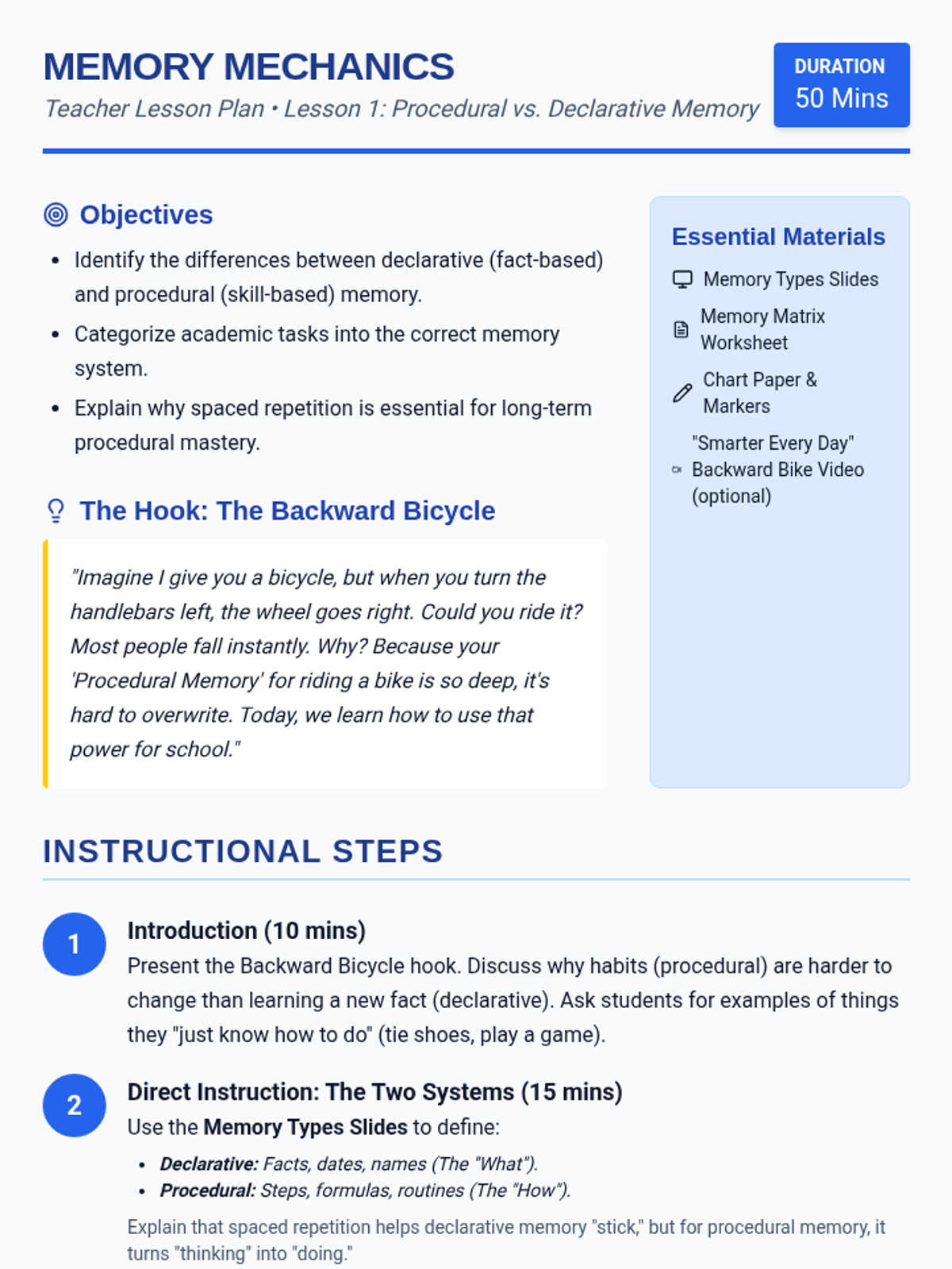 A 5-lesson sequence for 9th-grade students focusing on spaced repetition, backward planning, interleaving, and self-advocacy to improve exam preparation and long-term retention.