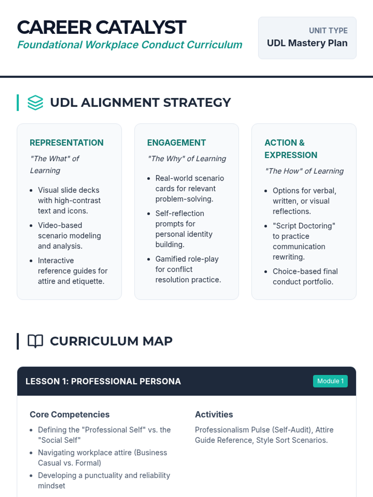 A comprehensive career readiness sequence for young adults focusing on professionalism, attire, teamwork, diversity, communication, and conflict resolution using UDL principles.