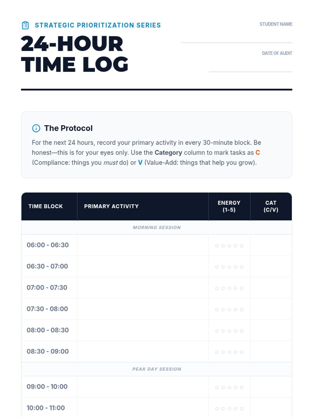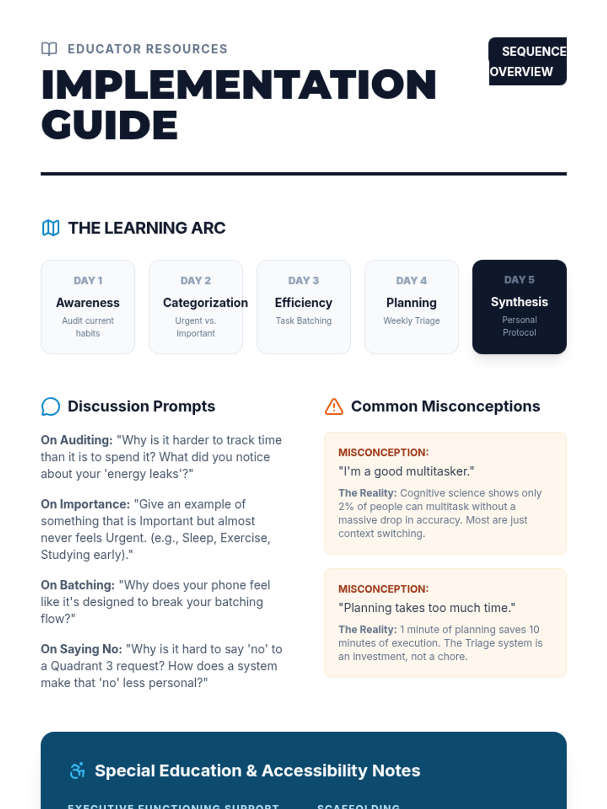 A comprehensive 5-lesson unit for 10th-grade students focusing on executive functioning skills to balance multiple commitments. Students learn time auditing, the Eisenhower Matrix, task batching, and weekly triage systems to develop a personalized priority protocol.