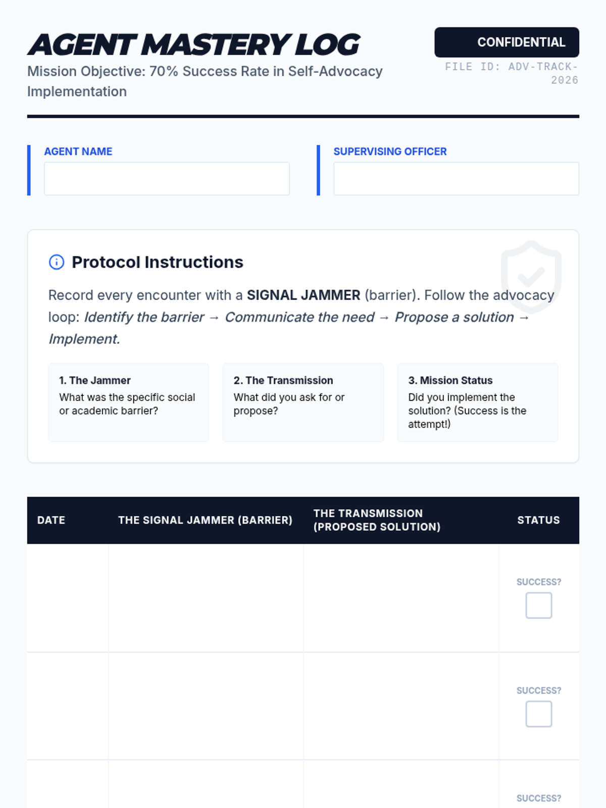 A comprehensive 20-week curriculum designed to empower students with self-advocacy skills, moving from identifying barriers to implementing personalized solutions.