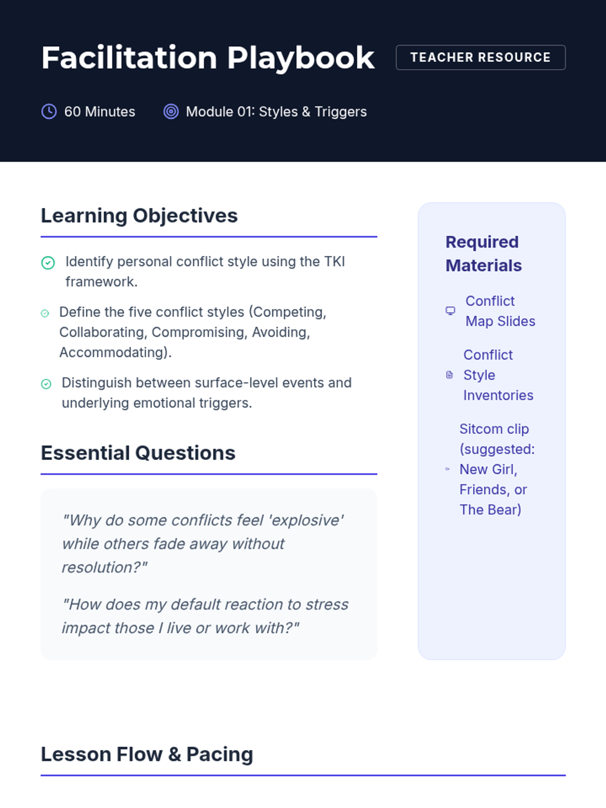 A comprehensive 4-lesson sequence designed for high school students to develop emotional regulation skills, move away from physical aggression, and master professional communication and de-escalation strategies.