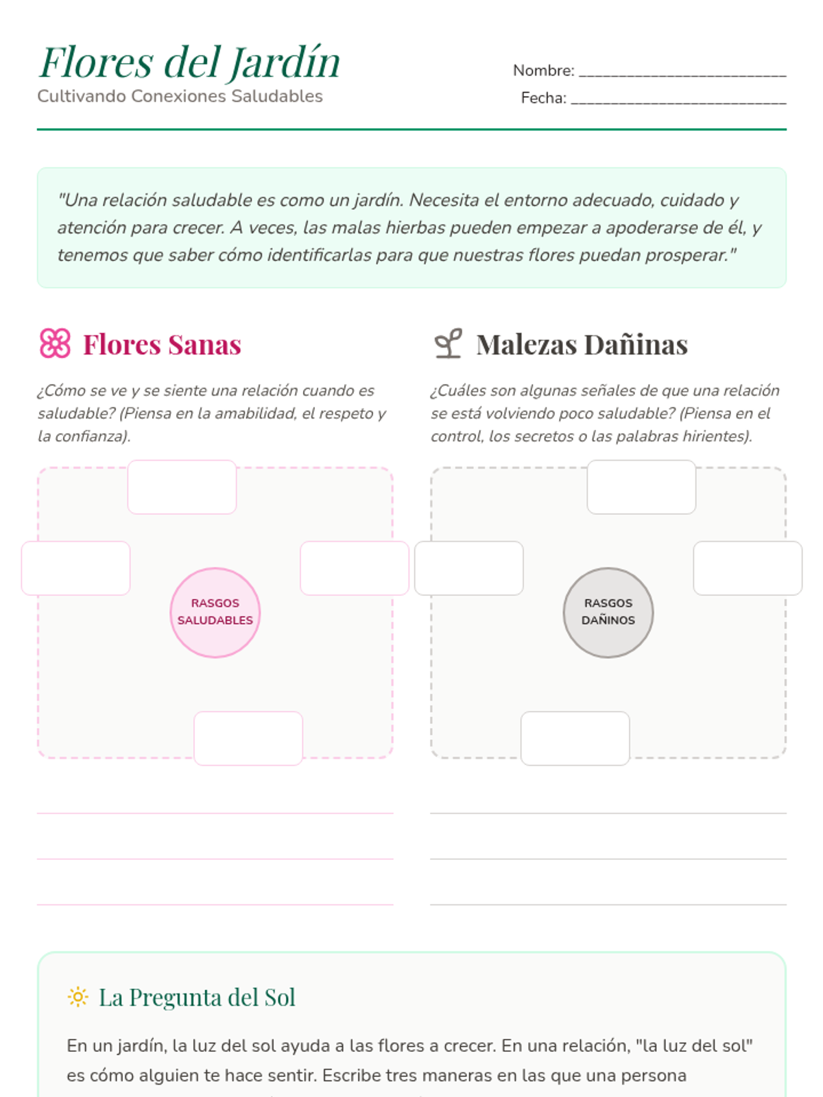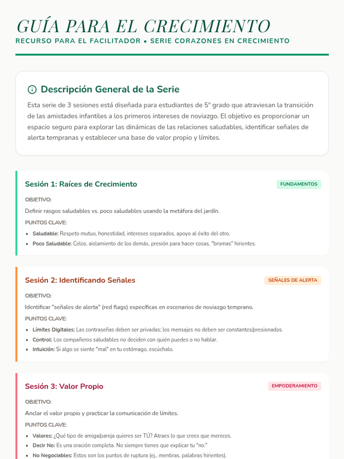 Una serie de consejería individual de 3 sesiones para estudiantes de quinto grado para explorar relaciones saludables versus no saludables, identificar señales de alerta y desarrollar límites personales y valor propio.