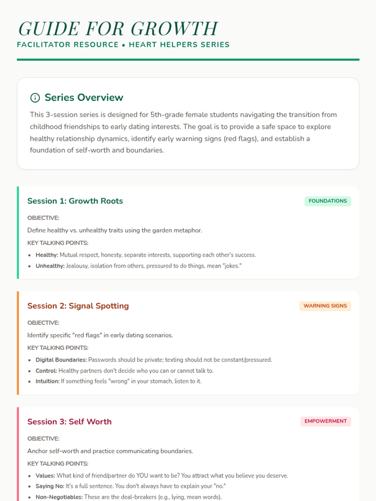 A 4-lesson curriculum designed for middle school girls to build healthy friendships, improve communication, and master conflict resolution through interactive worksheets and reflective activities.