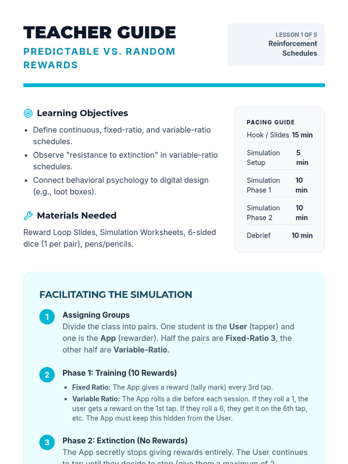 A 5-lesson sequence exploring how technology uses schedules of reinforcement (fixed and variable) to drive engagement. Students analyze gamification, social media mechanics, and ethical design to build digital literacy.