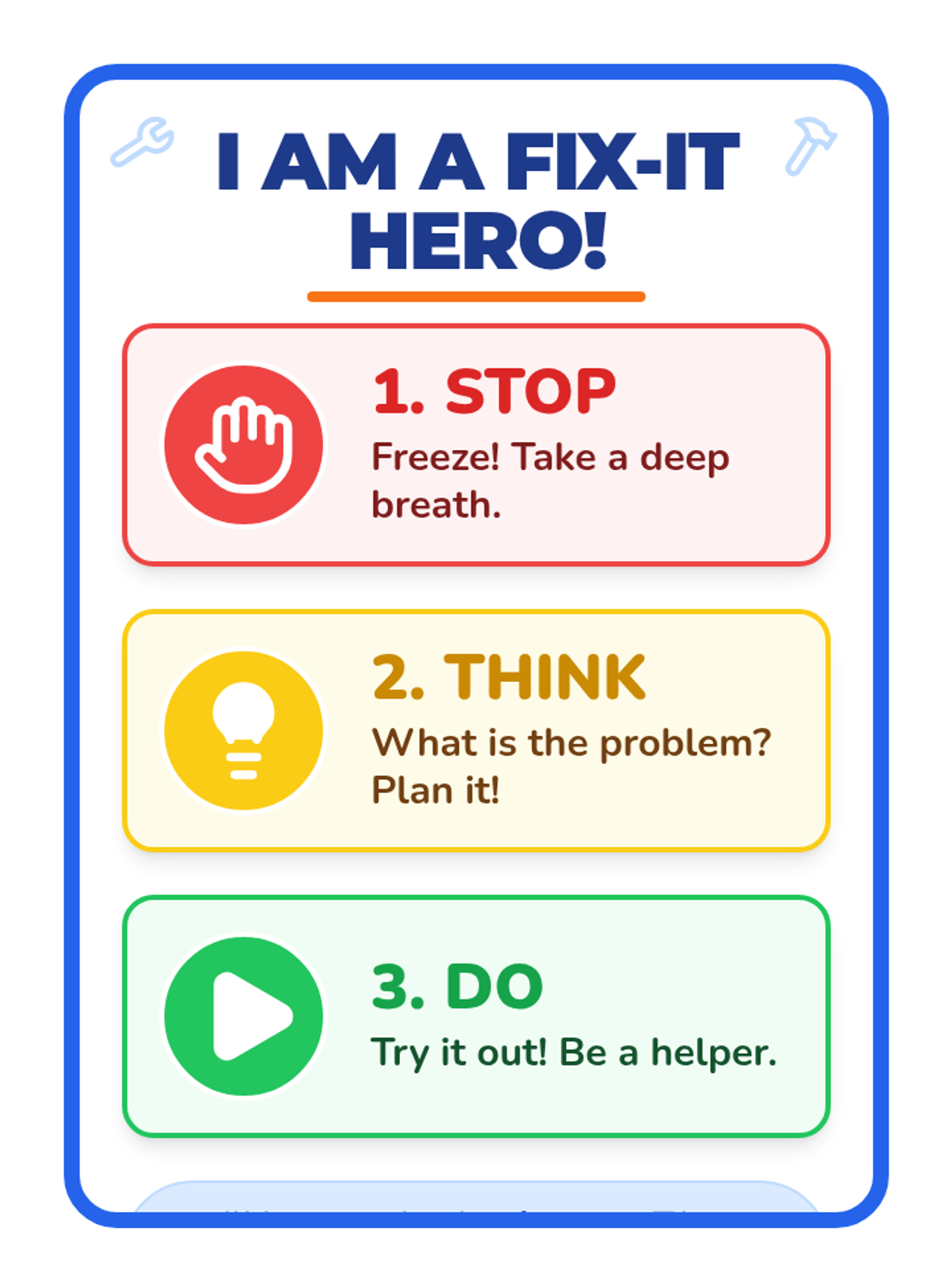 A simplified algorithmic approach to problem-solving for 1st Grade students, focusing on the 'Stop, Think, Do' framework to overcome obstacles and build independence.