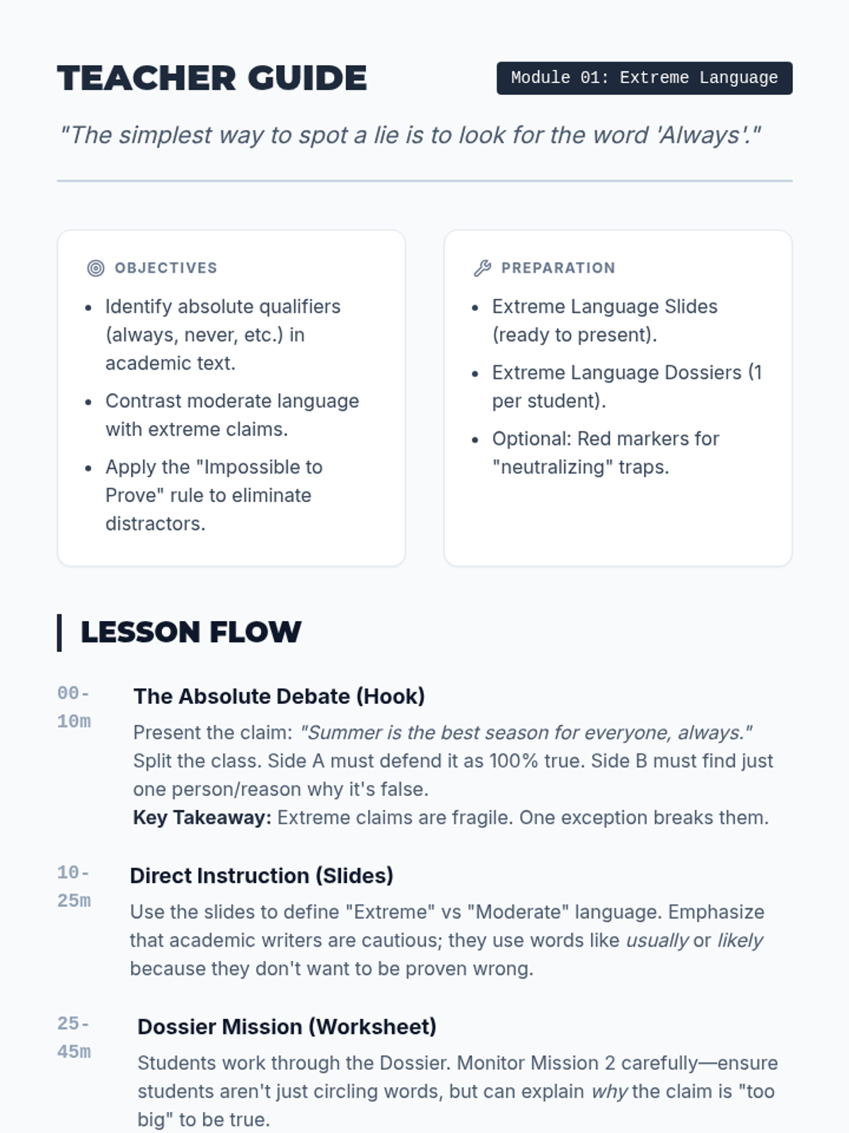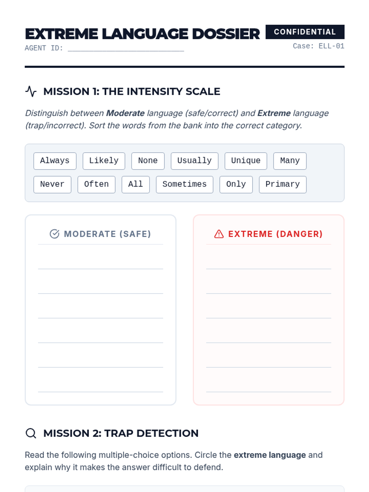 This sequence transforms students into 'Trap Detectives' who can identify and eliminate common distractors in academic tests. Students learn to spot extreme language, half-right traps, and out-of-scope answers through gamified lessons and role-reversal activities.