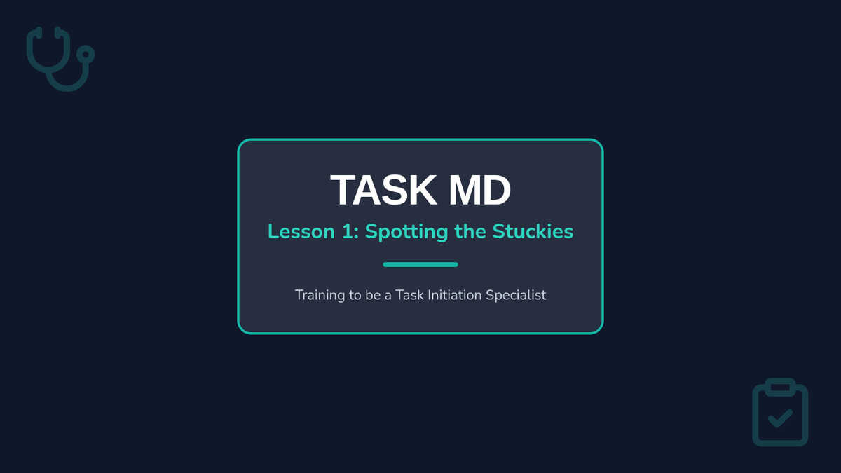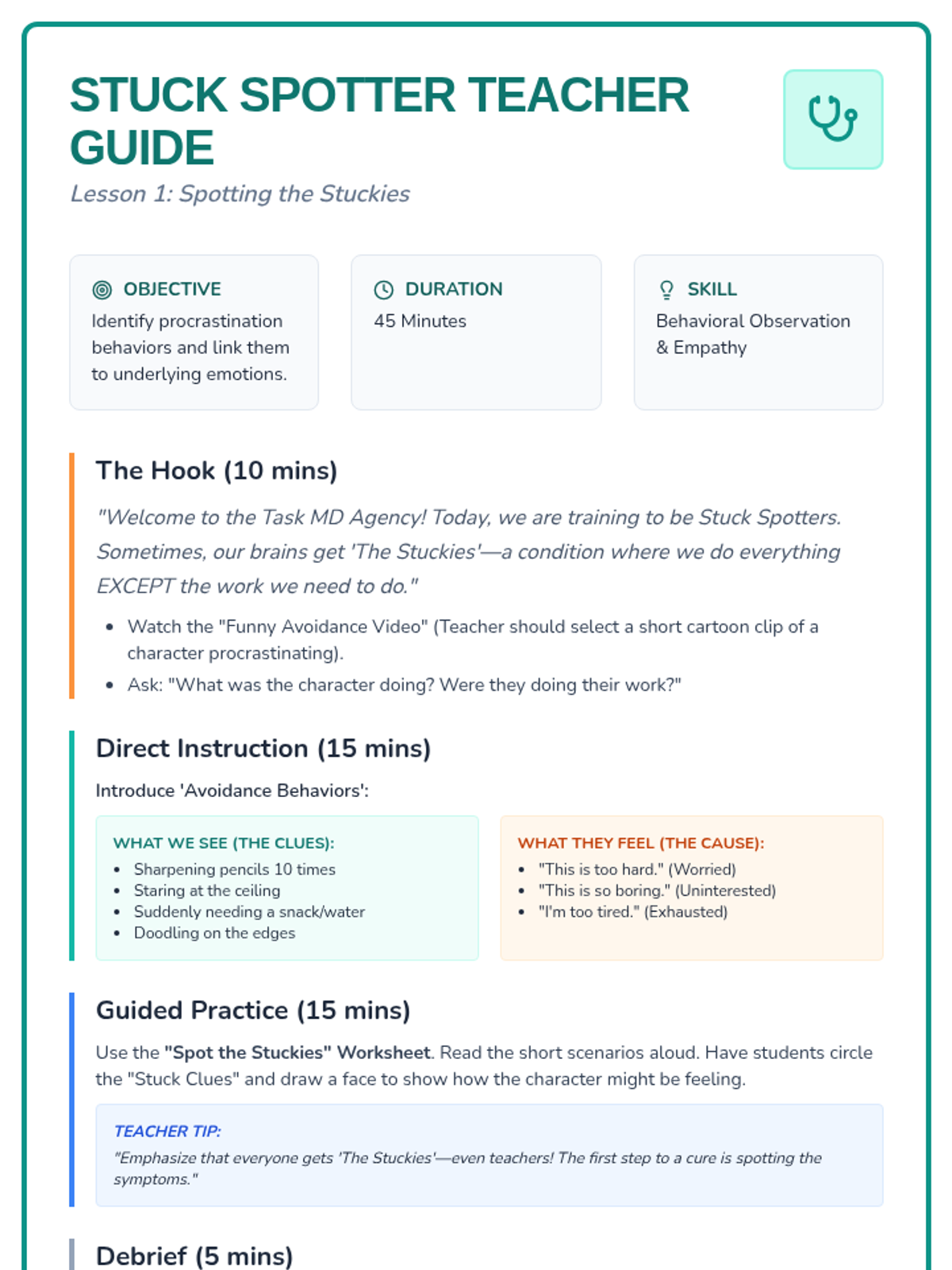 A sequence focused on helping students overcome emotional barriers to task initiation using a 'Task Doctor' theme. Students learn to identify avoidance behaviors, diagnose the root cause of being 'stuck', and prescribe effective self-talk solutions through role-play and reflection.